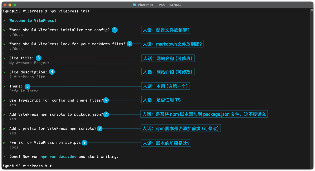 npx vitepress initpnpm vitepress inityarn vitepress initbun vitepress init运行后回答几个问题