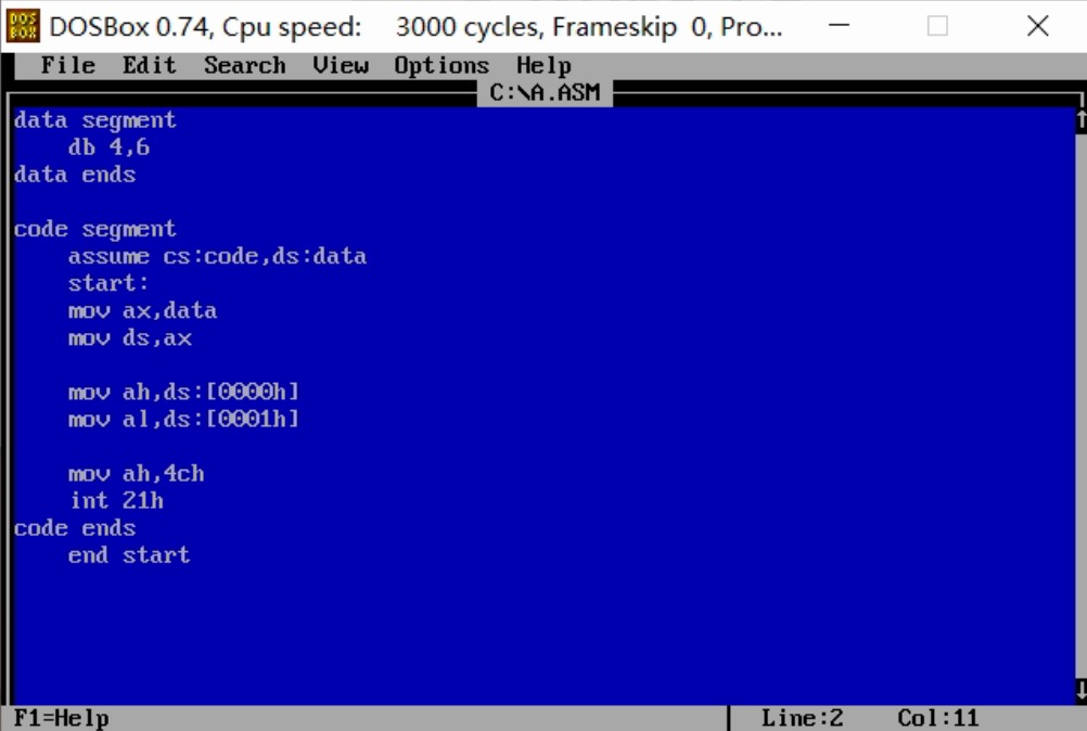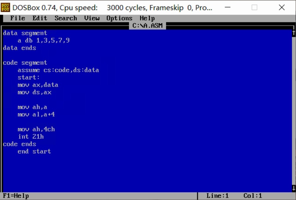 data segment str db 3 dup(5) data ends code segment assume cs:code,ds:data main: mov ax,data mov ds,ax edit: mov ah,4ch int 21h code ends end main