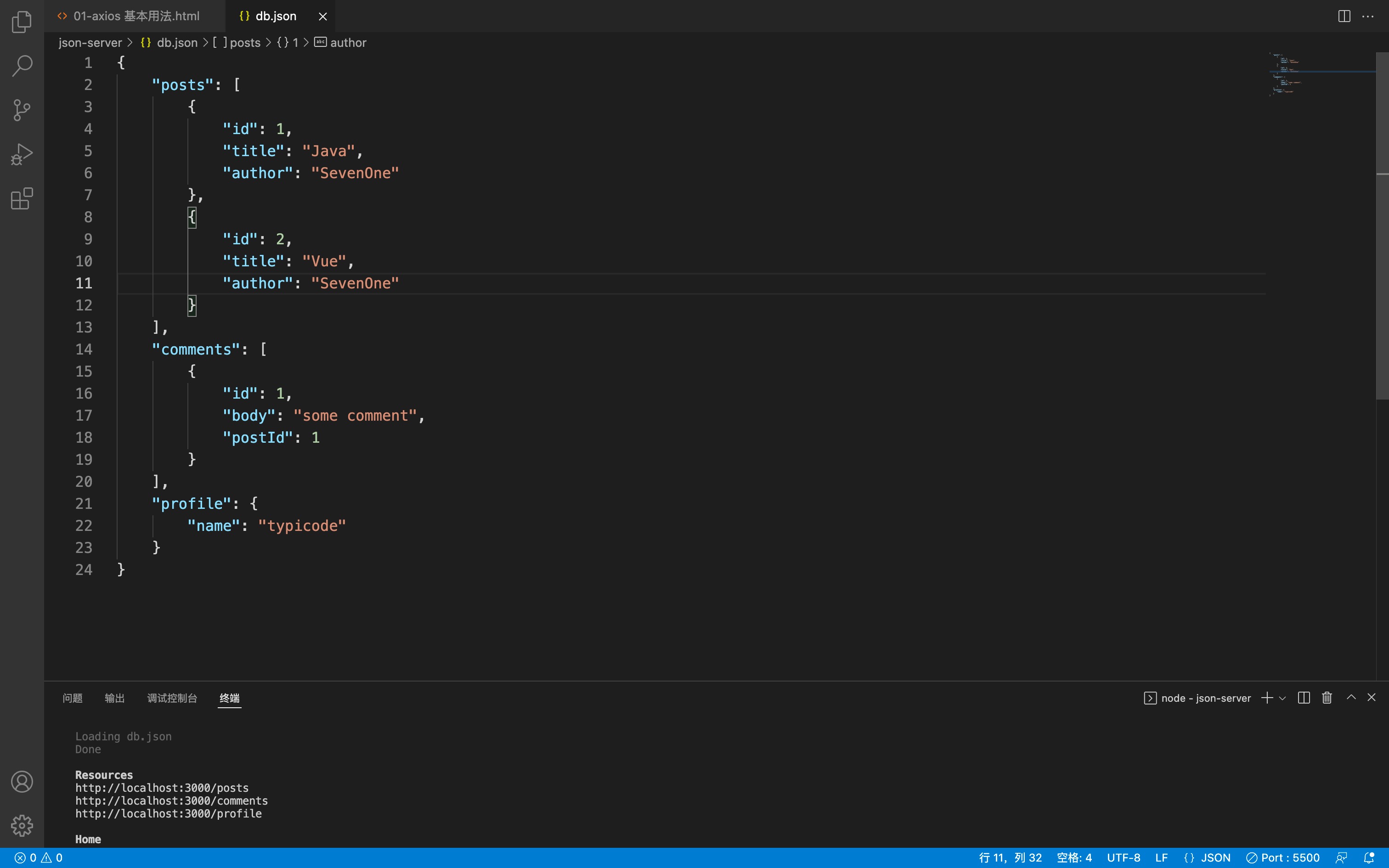 javascriptaxios({ method: 'POST', url: 'http://localhost:3000/posts', data: { title: 'H5+C3', author: '张三' } }).then(res => { console.log(res); })添加数据后,