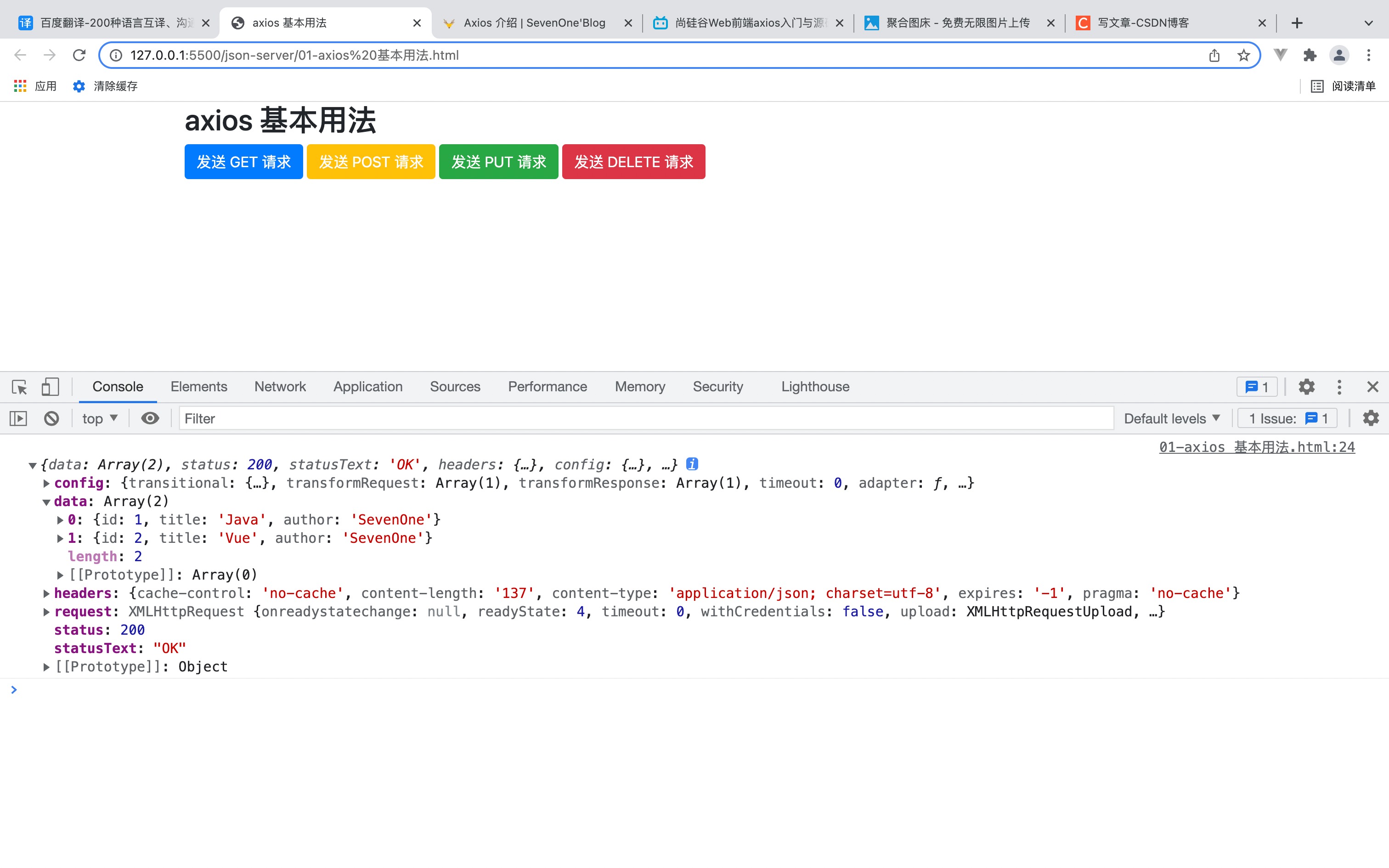 .html文件,查看运行效果html<!DOCTYPE html> <html lang="en"> <head> <meta charset="UTF-8"> <title>axios 基本用法</title> <script src="https://cdnjs.cloudflare.com/ajax/libs/axios/0.25.0/axios.min.js"></script> <link href="https://cdnjs.cloudflare.com/ajax/libs/twitter-bootstrap/4.6.1/css/bootstrap.min.css" rel="stylesheet"> </head> <body> <div class="container"> <h2 class="page-header">axios 基本用法</h2> <button class="btn btn-primary">发送 GET 请求</button> <button class="btn btn-warning" style="color: white;">发送 POST 请求</button> <button class="btn btn-success">发送 PUT 请求</button> <button class="btn btn-danger">发送 DELETE 请求</button> </div> <script> console.log(axios); </script> </body> </html>