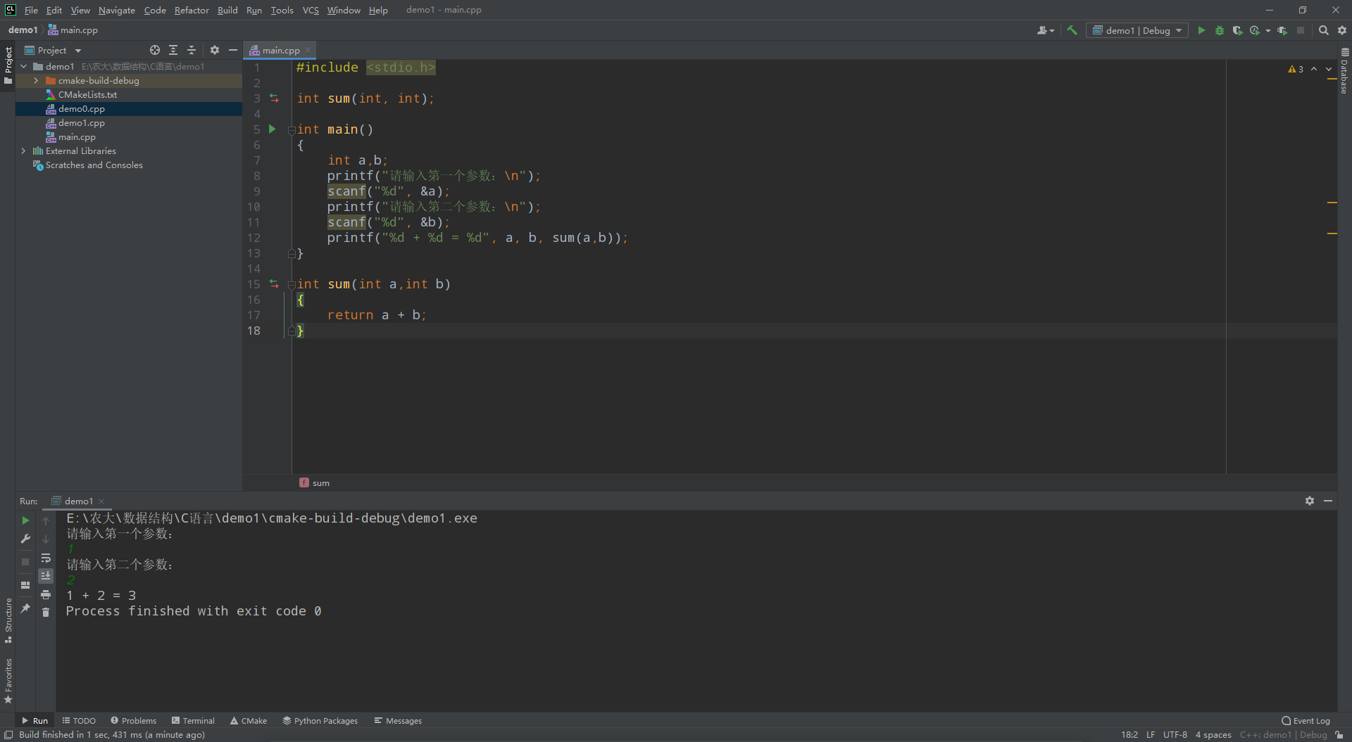 c#include <stdio.h> int sum(int, int); int main() { int a,b; printf("请输入第一个参数:\n"); scanf("%d", &a); printf("请输入第二个参数:\n"); scanf("%d", &b); printf("%d + %d = %d", a, b, sum(a,b)); } int sum(int a,int b) { return a + b; }运行结果: