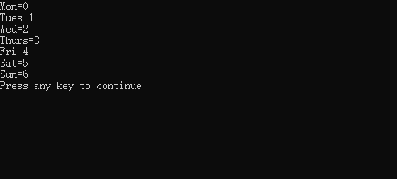 c#include <stdio.h> int main() { enum week{Mon, Tues, Wed, Thurs, Fri, Sat, Sun}; printf("Mon=%d\nTues=%d\nWed=%d\nThurs=%d\nFri=%d\nSat=%d\nSun=%d\n", Mon, Tues, Wed, Thurs, Fri, Sat, Sun); }运行效果