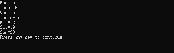 c#include <stdio.h> int main() { enum week{Mon = 10, Tues = 15, Wed, Thurs, Fri, Sat, Sun}; printf("Mon=%d\nTues=%d\nWed=%d\nThurs=%d\nFri=%d\nSat=%d\nSun=%d\n", Mon, Tues, Wed, Thurs, Fri, Sat, Sun); }运行效果