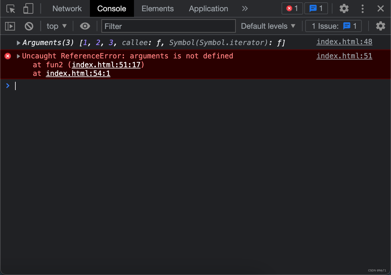 javascriptlet fun1 = function(){ console.log(arguments); } let fun2 = () => { console.log(arguments); } fun1(1,2,3); fun2(4,5,6); // 报错
