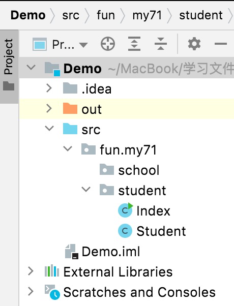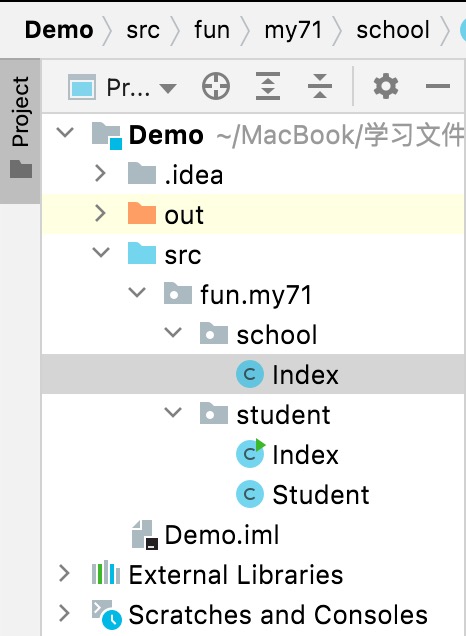 Index.java文件中引入Student.java即可。javapackage fun.my71.school; import fun.my71.student.Student; public class Index { public static void main(String[] args) { Student stu = new Student(1001,"张三",21); stu.pStudentInfo(); } }