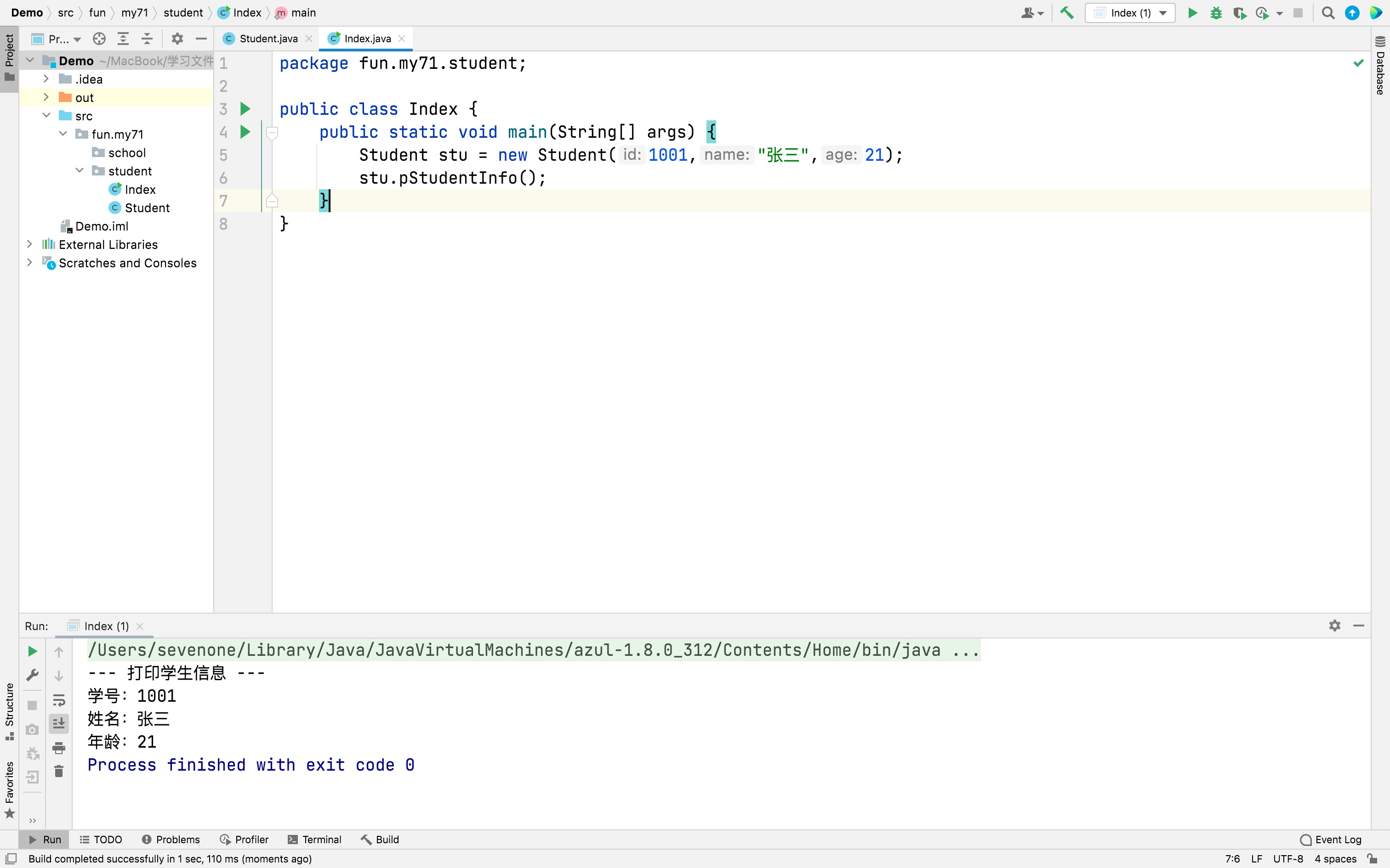 javapackage fun.my71.student; public class Index { public static void main(String[] args) { Student stu = new Student(1001,"张三",21); stu.pStudentInfo(); } }运行 Index.java