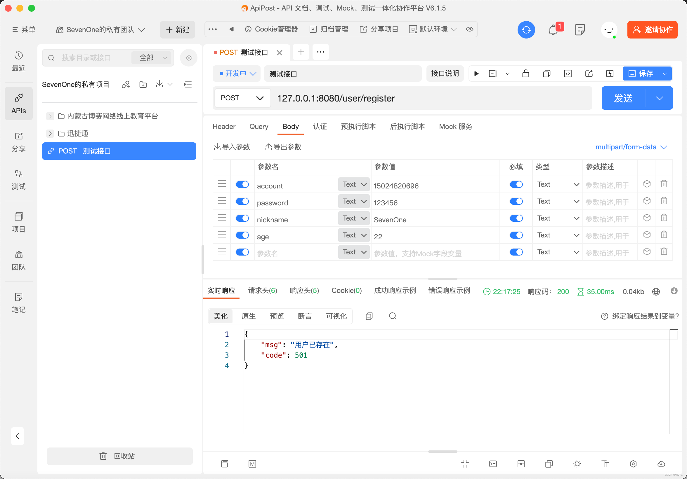 java@RequestMapping("/register") public Map<String, Object> register(String account,String password,String nickname,int age) { int code = 200; String msg = "success"; Map<String, Object> map = new HashMap<>(); User user = um.getByAccount(account); if (user == null) { um.insert(new User(account,password,nickname,age)); } else { code = 501; msg = "用户已存在"; } map.put("code",code); map.put("msg",msg); return map; }