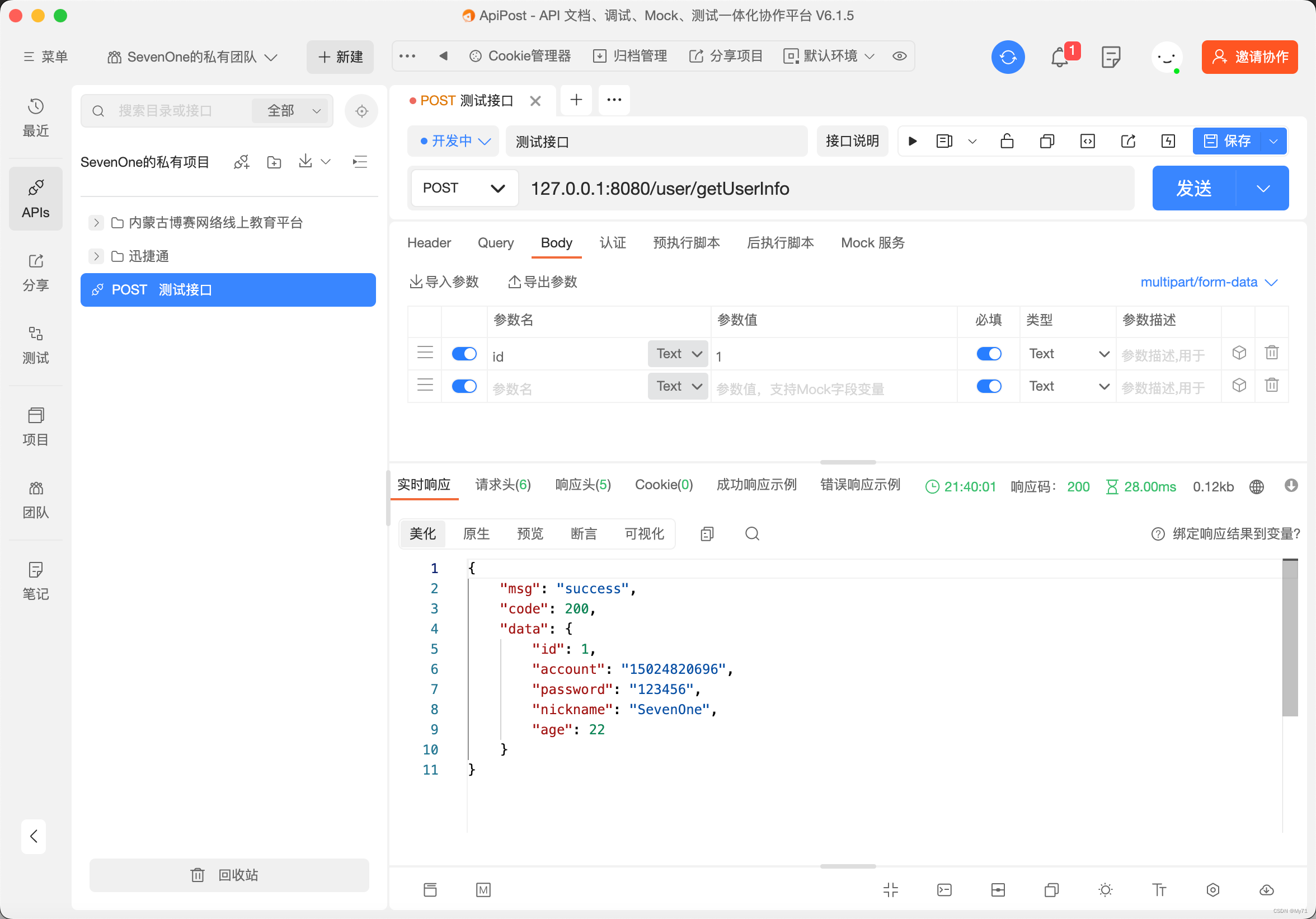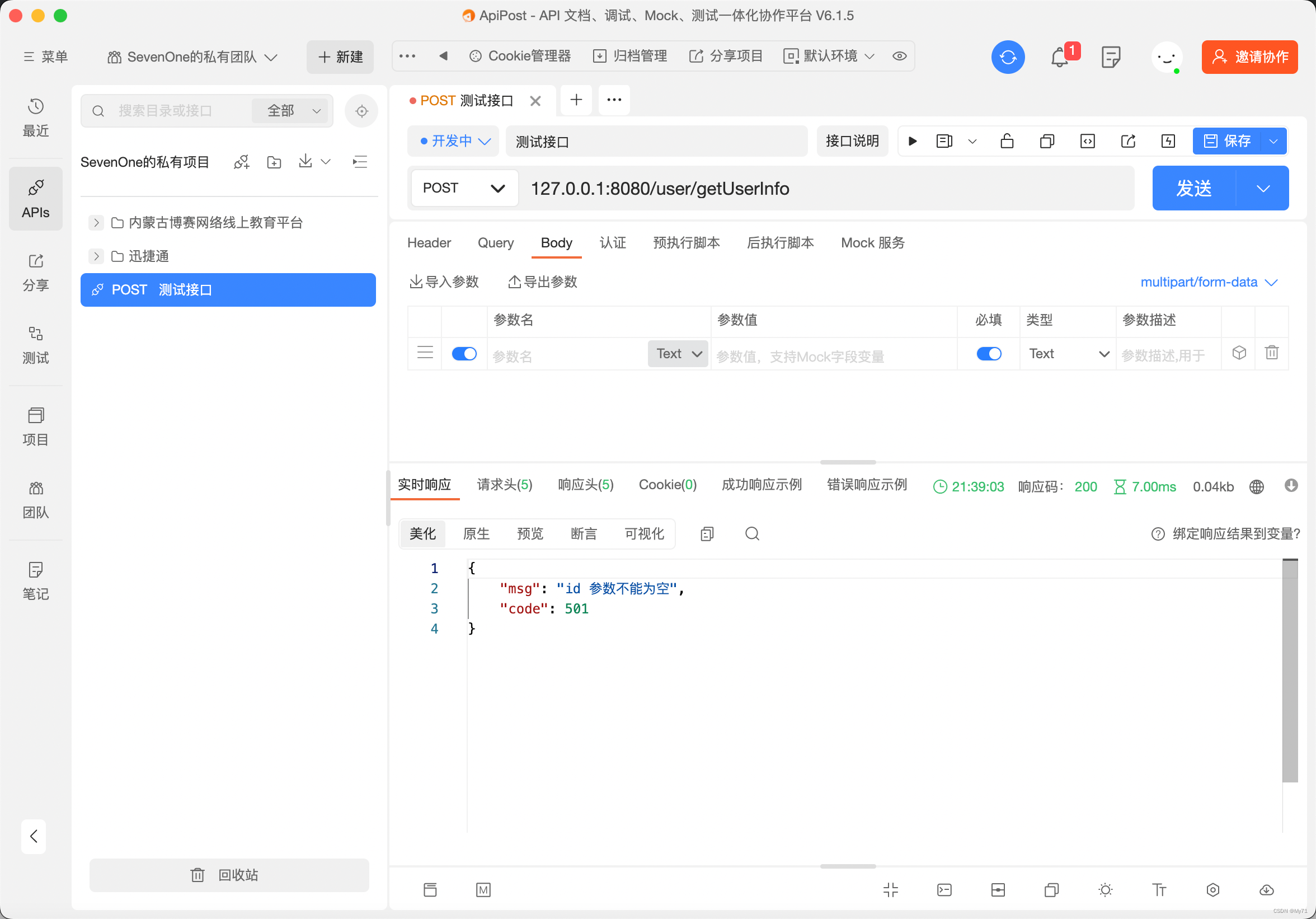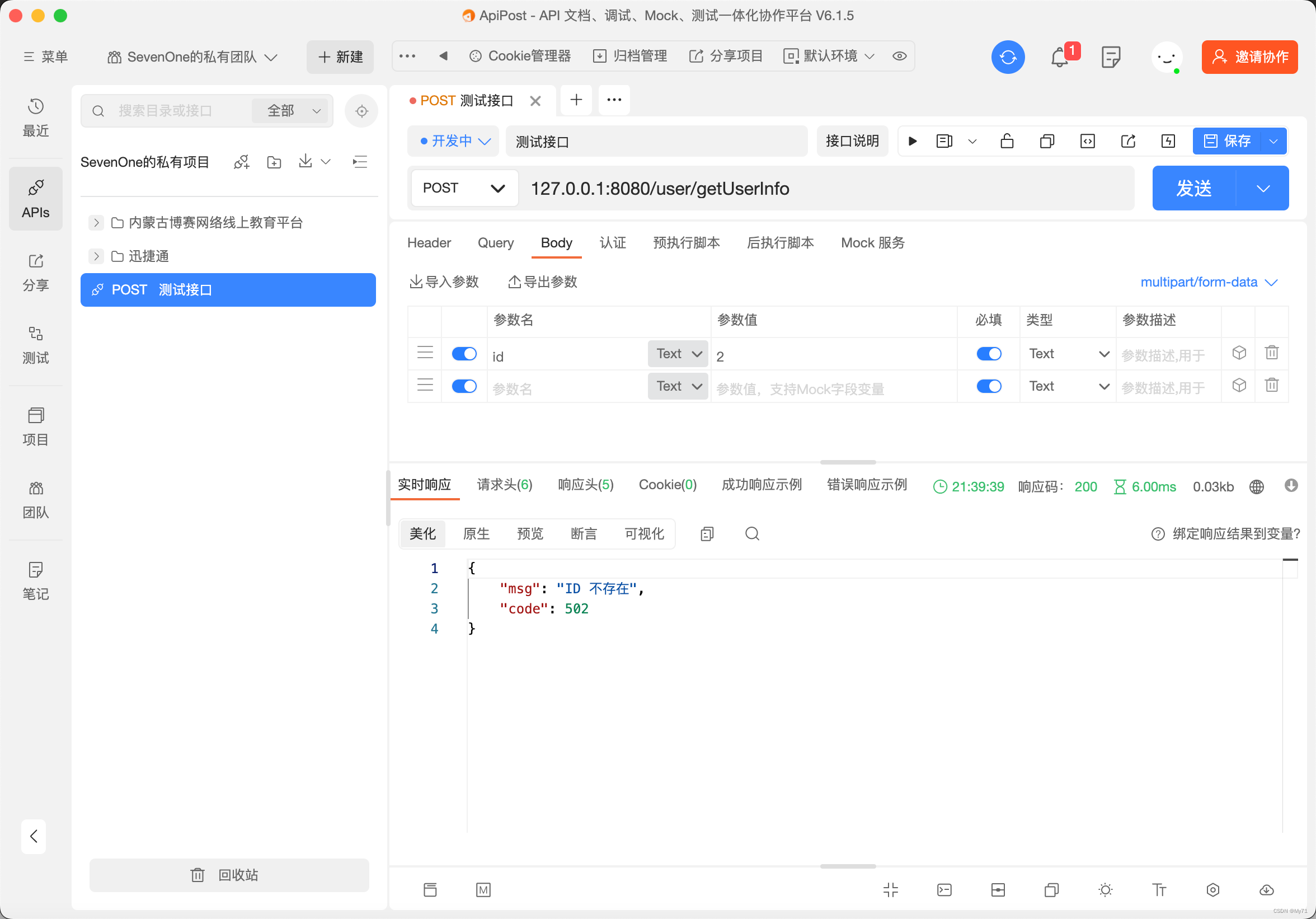 java@RequestMapping("/getUserInfo") public Map<String, Object> getUserInfo(Integer id) { int code = 200; String msg = "success"; Map<String, Object> map = new HashMap<>(); if (id == null) { code = 501; msg = "id 参数不能为空"; } else { User user = um.getById(id); if (user == null) { code = 502; msg = "ID 不存在"; } else { map.put("data",user); } } map.put("code",code); map.put("msg",msg); return map; }