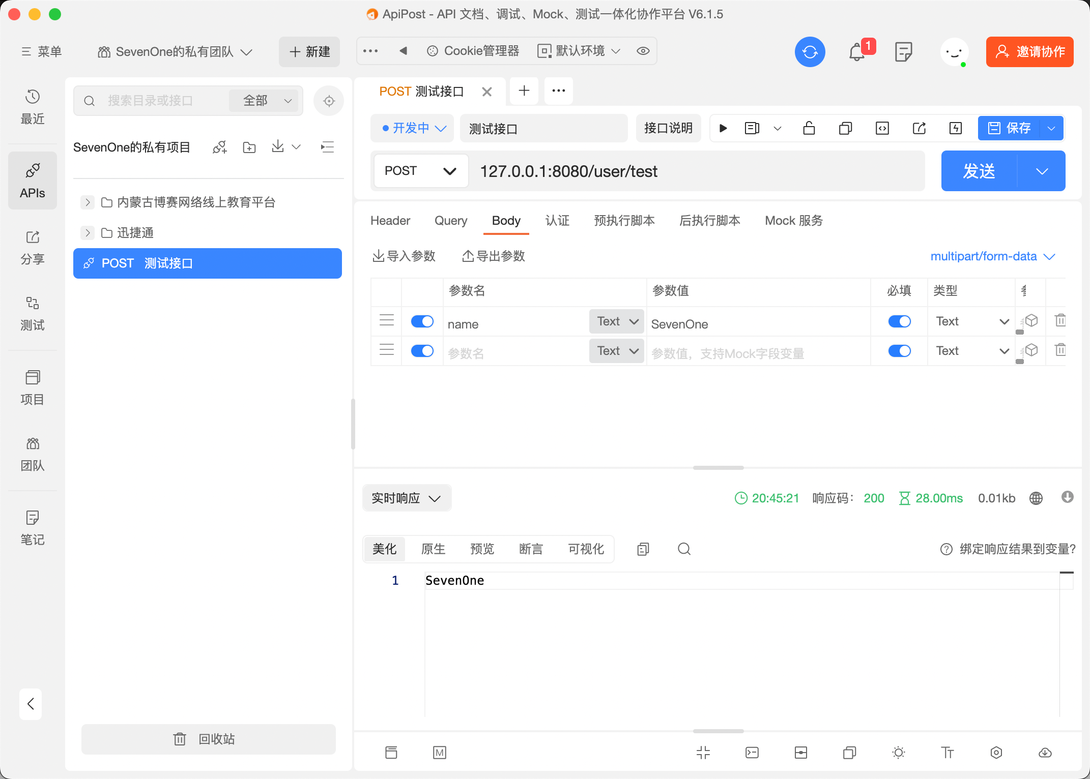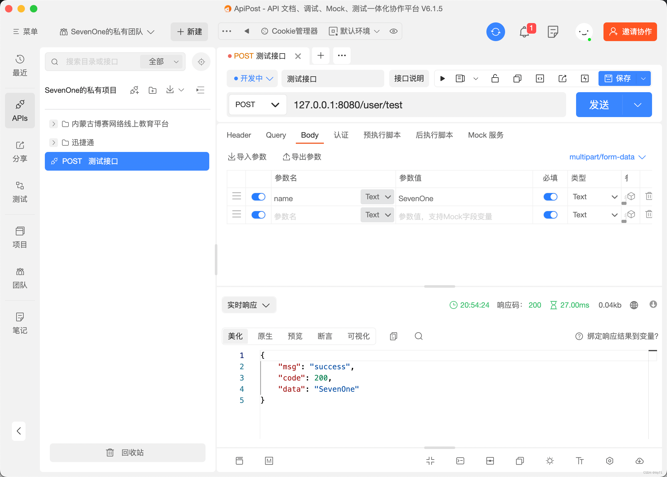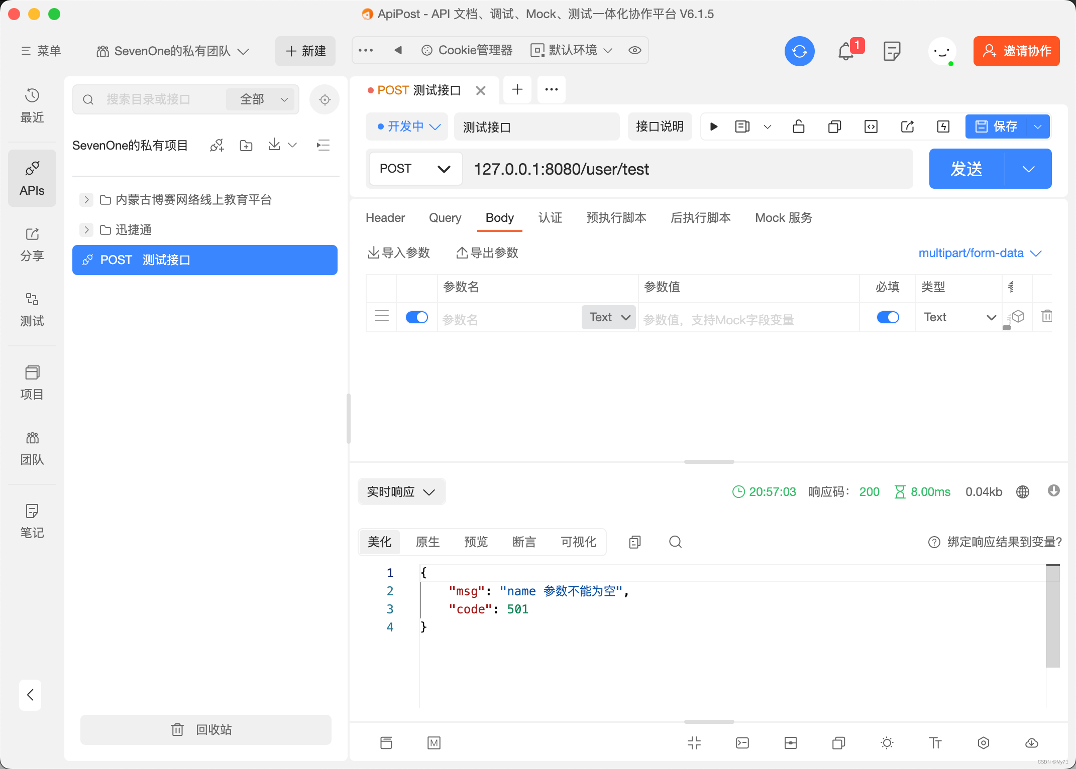javapackage com.springboot.controller; import org.springframework.web.bind.annotation.*; import java.util.HashMap; import java.util.Map; @RestController @RequestMapping("/user") public class UserController { @RequestMapping("/test") public Map<String, Object> test(String name) { int code = 200; String msg = "success"; Map<String, Object> map = new HashMap<>(); if (name == null) { code = 501; msg = "name 参数不能为空"; } else { map.put("data",name); } map.put("code",code); map.put("msg",msg); return map; } }