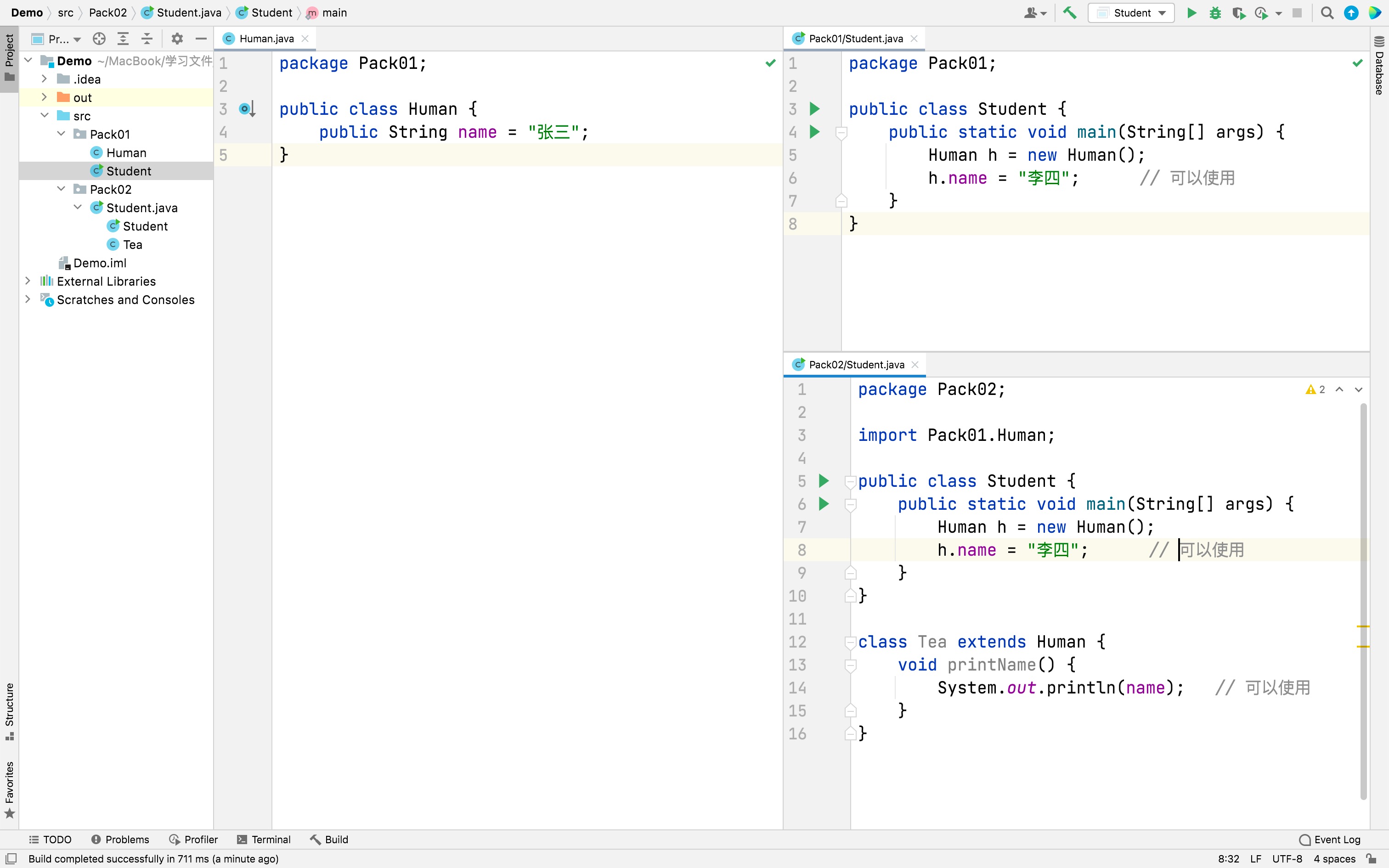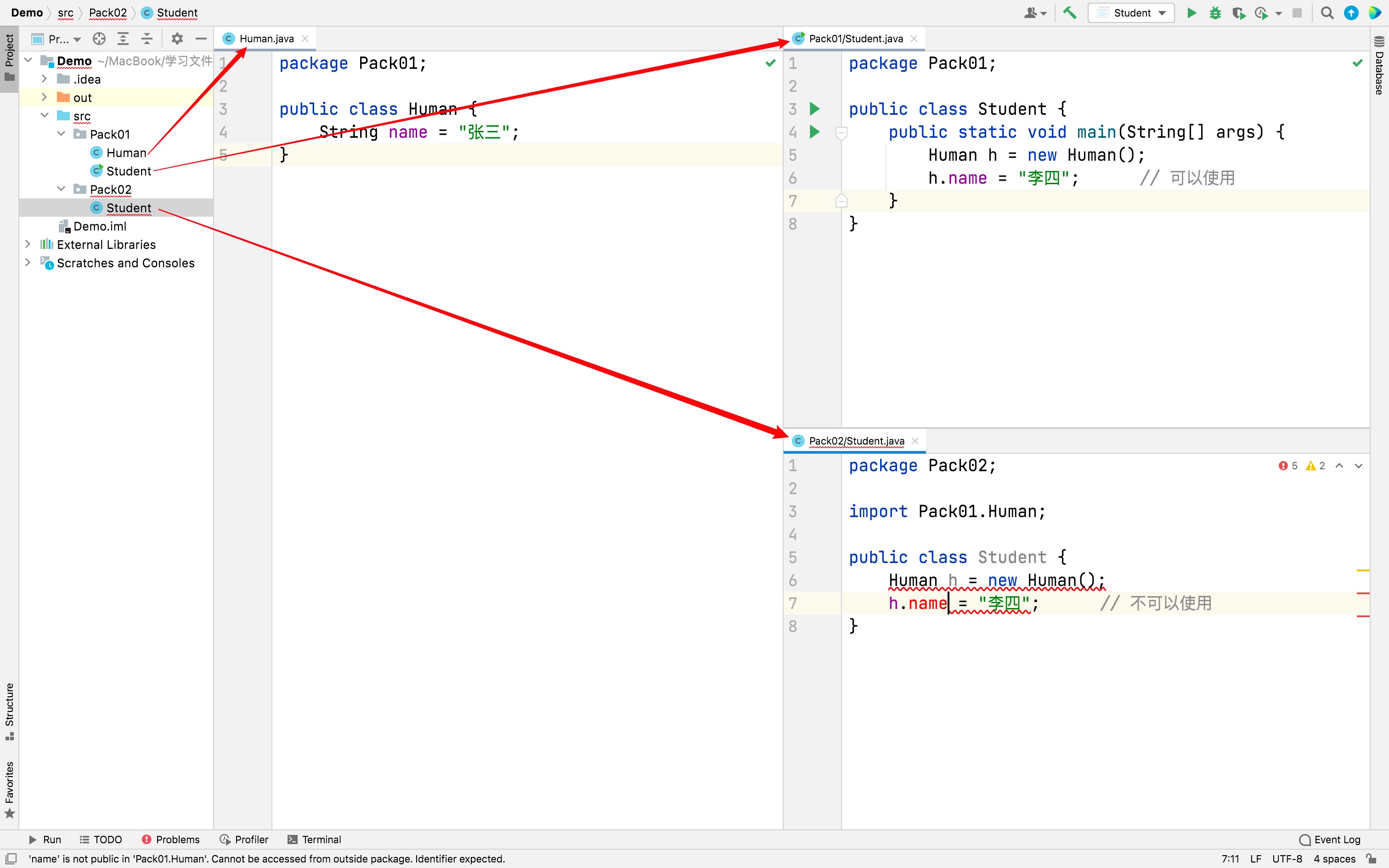 Human.java 文件第4行定义一个 name 属性,前面没有加任何修饰符,默认是 default