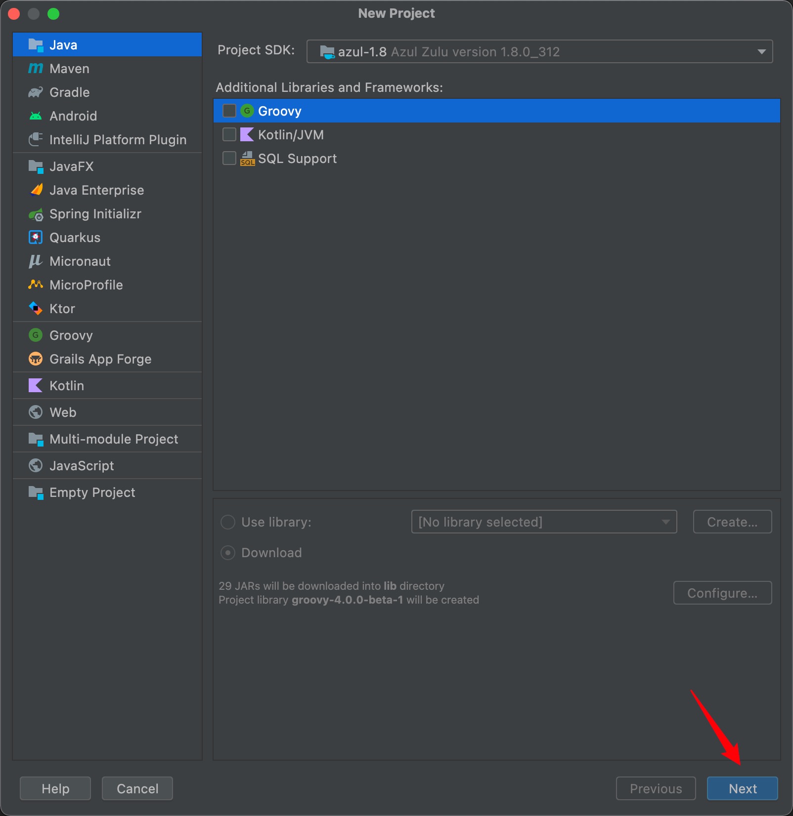 点击 Project 后会进入 New Project 界面,选择 Project SDK 后直接点击 Next