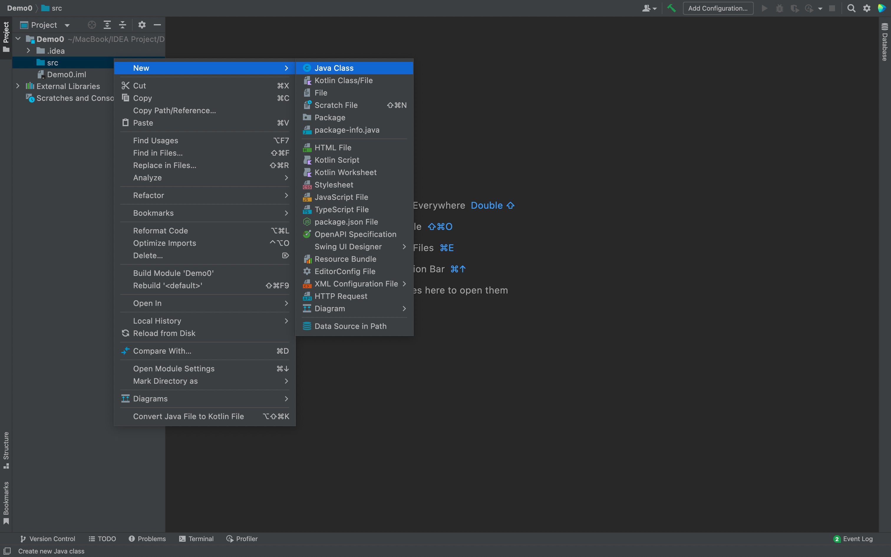 在 src 目录上右键,选择 New -> Java Class 创建 .java 文件。