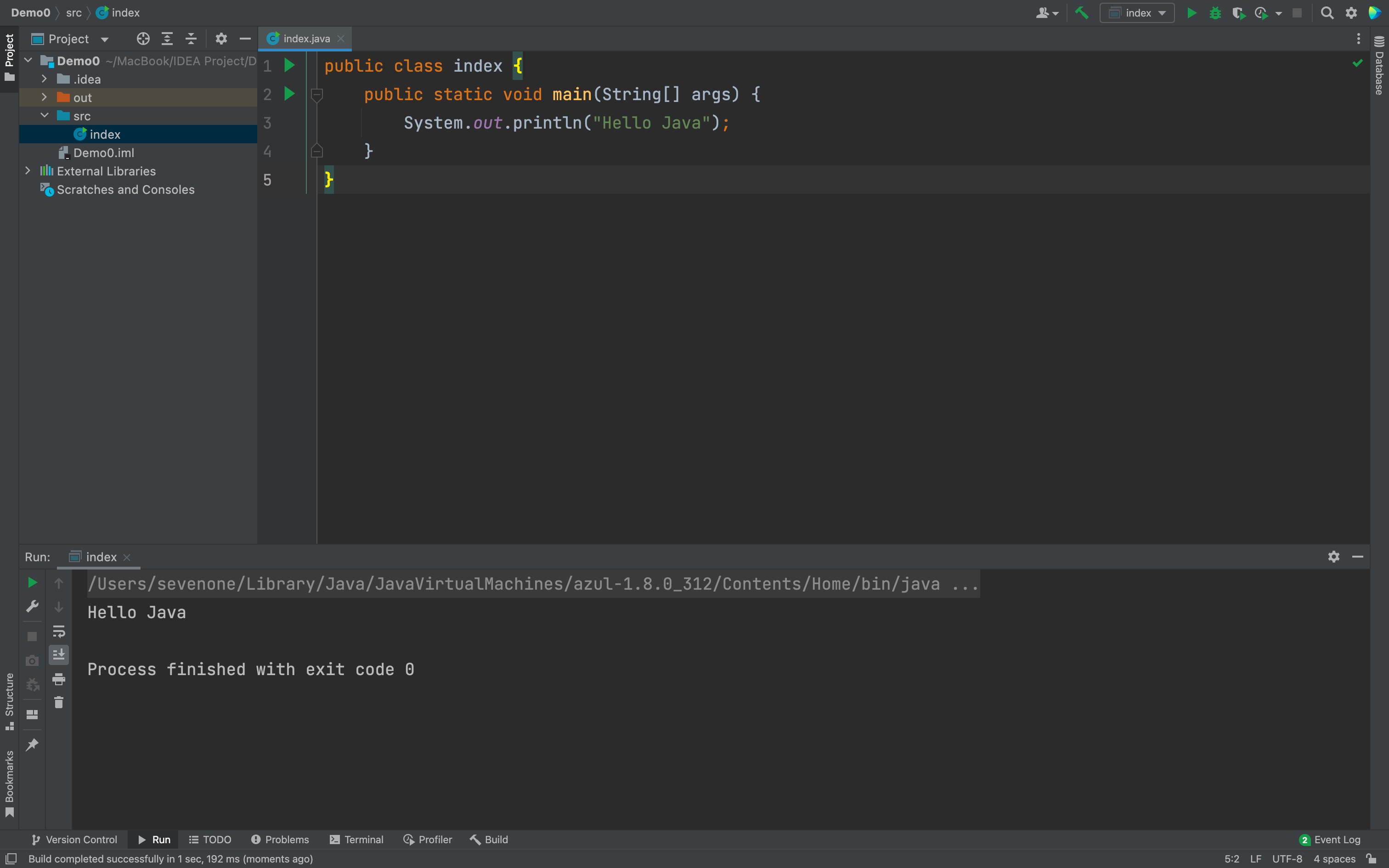 javapublic class index { public static void main(String[] args) { System.out.println("Hello Java"); } }右键或使用快捷键运行程序