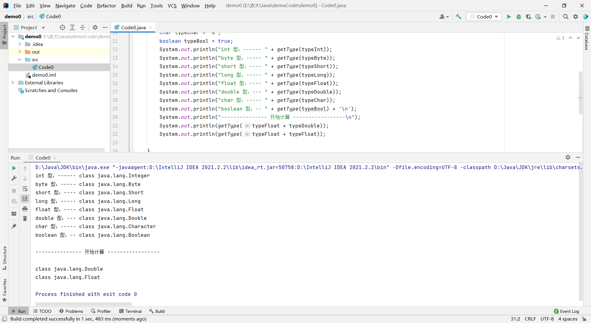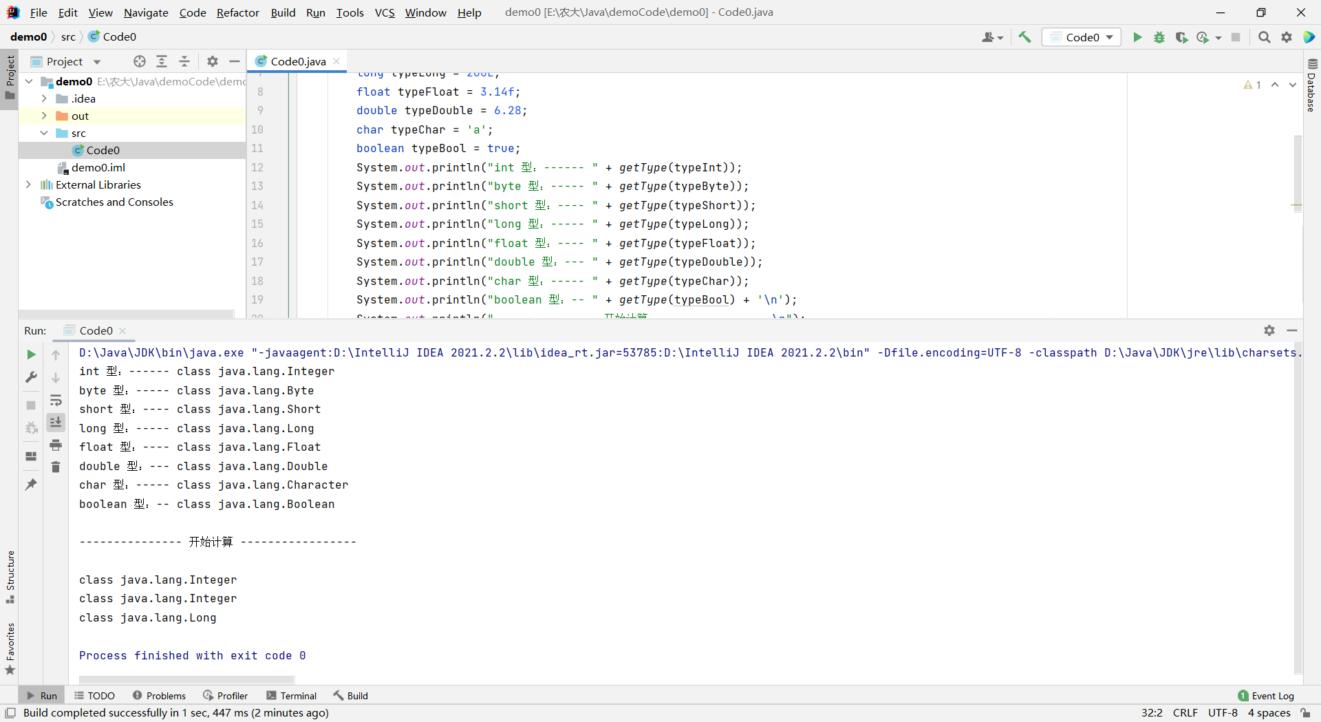 javapublic class Code0 { public static void main(String[] args) { int typeInt = 10; byte typeByte = 1; short typeShort = 2; long typeLong = 200L; float typeFloat = 3.14f; double typeDouble = 6.28; char typeChar = 'a'; boolean typeBool = true; System.out.println("int 型:------ " + getType(typeInt)); System.out.println("byte 型:----- " + getType(typeByte)); System.out.println("short 型:---- " + getType(typeShort)); System.out.println("long 型:----- " + getType(typeLong)); System.out.println("float 型:---- " + getType(typeFloat)); System.out.println("double 型:--- " + getType(typeDouble)); System.out.println("char 型:----- " + getType(typeChar)); System.out.println("boolean 型:-- " + getType(typeBool) + '\n'); System.out.println("--------------- 开始计算 -----------------\n"); System.out.println(getType(typeFloat + typeDouble)); System.out.println(getType(typeFloat + typeFloat)); } // 返回数据类型 public static String getType(Object o) { return o.getClass().toString(); } }