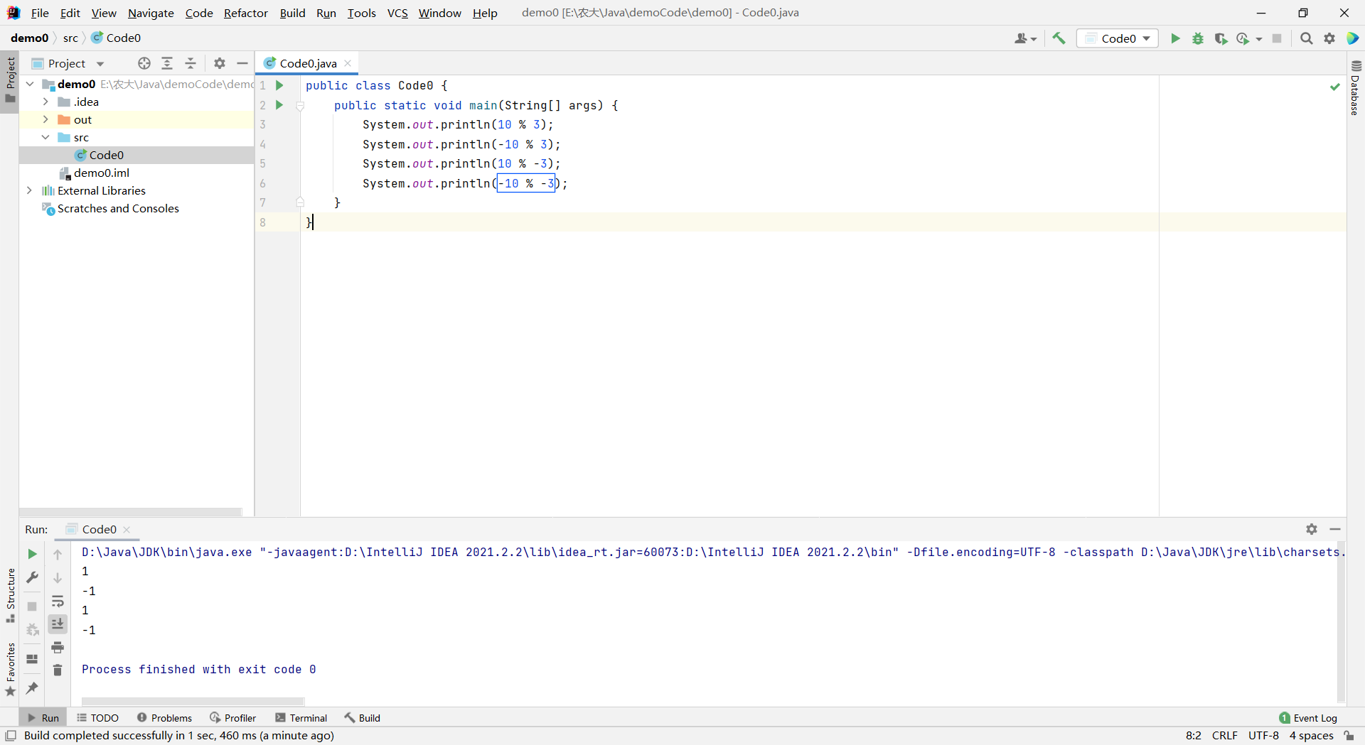 javapublic class Code0 { public static void main(String[] args) { System.out.println(10 % 3); System.out.println(-10 % 3); System.out.println(10 % -3); System.out.println(-10 % -3); } }运算结果: