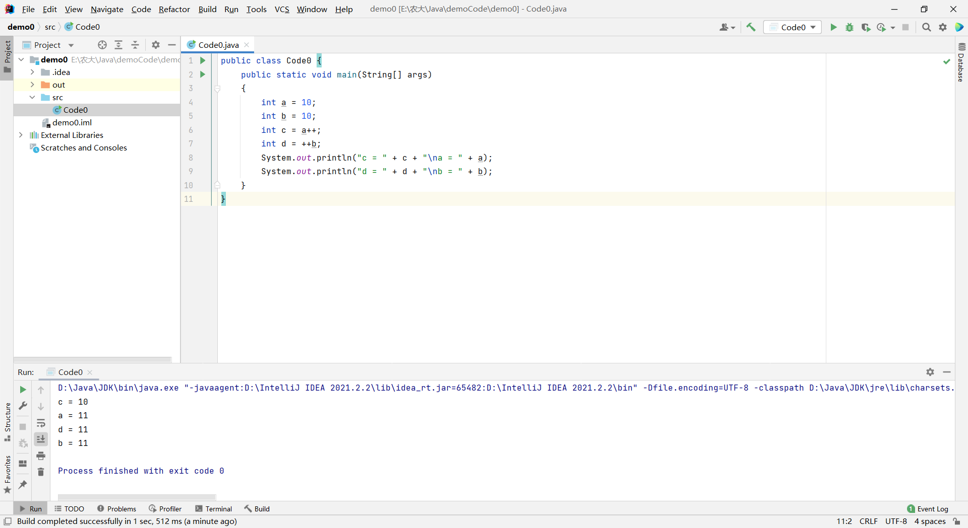 javapublic class Code0 { public static void main(String[] args) { int a = 10; int b = 10; int c = a++; int d = ++b; System.out.println("c = " + c + "\na = " + a); System.out.println("d = " + d + "\nb = " + b); } }运行结果:
