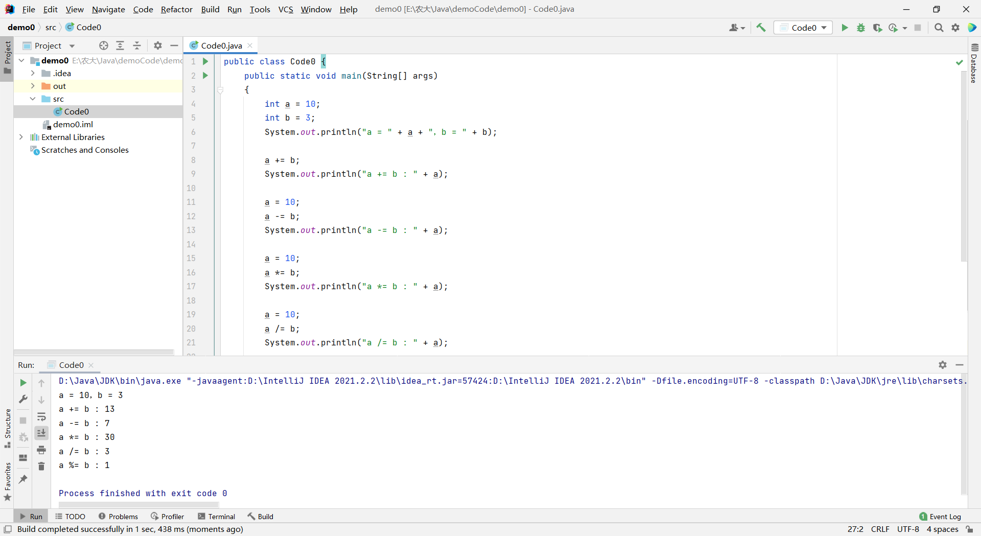 javapublic class Code0 { public static void main(String[] args) { int a = 10; int b = 3; System.out.println("a = " + a + ",b = " + b); a += b; System.out.println("a += b : " + a); a = 10; a -= b; System.out.println("a -= b : " + a); a = 10; a *= b; System.out.println("a *= b : " + a); a = 10; a /= b; System.out.println("a /= b : " + a); a = 10; a %= b; System.out.println("a %= b : " + a); } }运行结果: