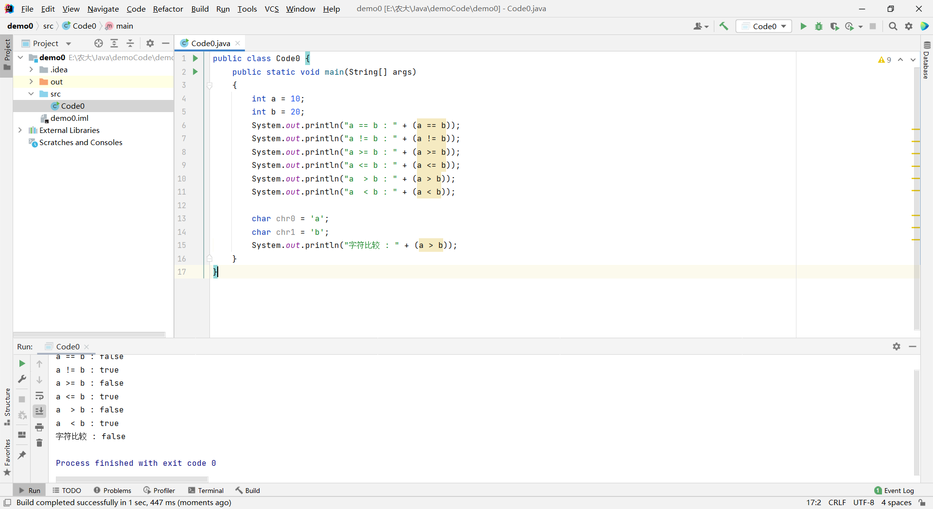 javapublic class Code0 { public static void main(String[] args) { int a = 10; int b = 20; System.out.println("a == b : " + (a == b)); System.out.println("a != b : " + (a != b)); System.out.println("a >= b : " + (a >= b)); System.out.println("a <= b : " + (a <= b)); System.out.println("a > b : " + (a > b)); System.out.println("a < b : " + (a < b)); char chr0 = 'a'; char chr1 = 'b'; System.out.println("字符比较 : " + (a > b)); } }运行结果: