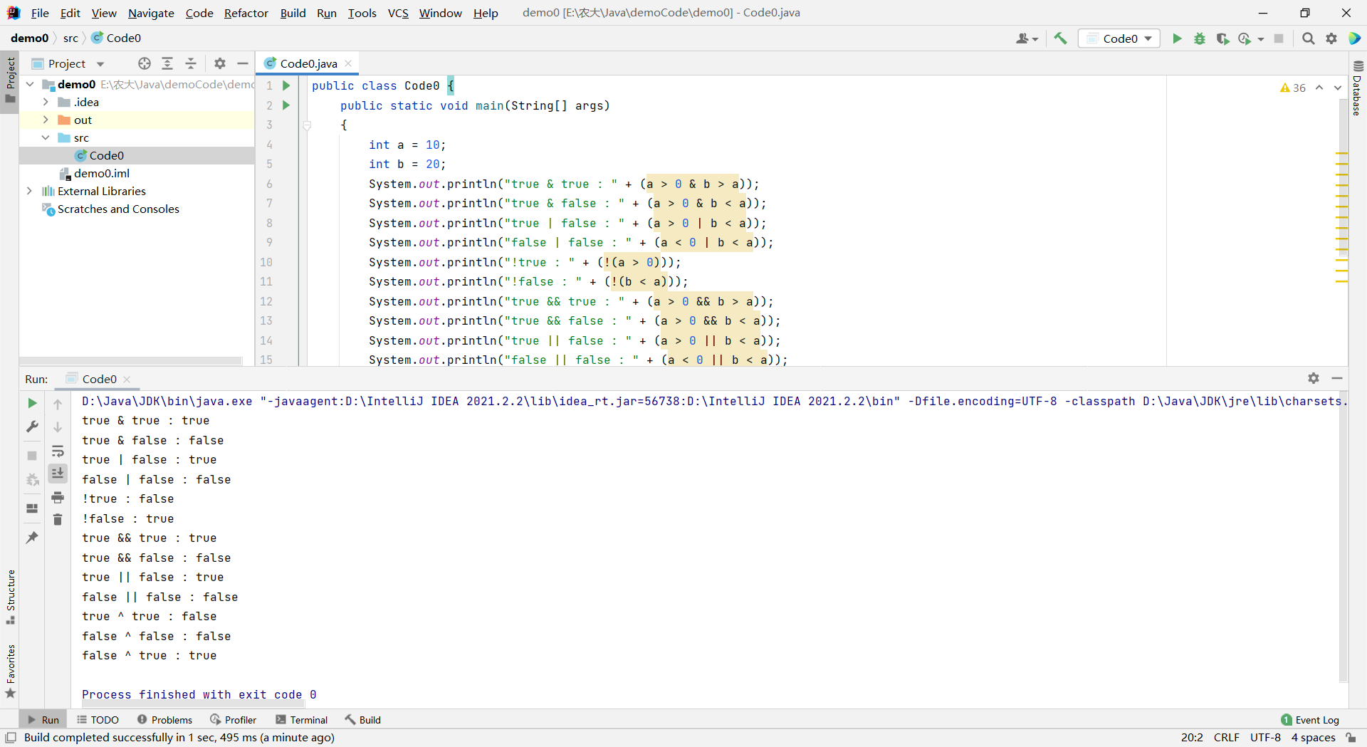 javapublic class Code0 { public static void main(String[] args) { int a = 10; int b = 20; System.out.println("true & true : " + (a > 0 & b > a)); System.out.println("true & false : " + (a > 0 & b < a)); System.out.println("true | false : " + (a > 0 | b < a)); System.out.println("false | false : " + (a < 0 | b < a)); System.out.println("!true : " + (!(a > 0))); System.out.println("!false : " + (!(b < a))); System.out.println("true && true : " + (a > 0 && b > a)); System.out.println("true && false : " + (a > 0 && b < a)); System.out.println("true || false : " + (a > 0 || b < a)); System.out.println("false || false : " + (a < 0 || b < a)); System.out.println("true ^ true : " + (a > 0 ^ b > a)); System.out.println("false ^ false : " + (a < 0 ^ b < a)); System.out.println("false ^ true : " + (a < 0 ^ b > a)); } }运行结果: