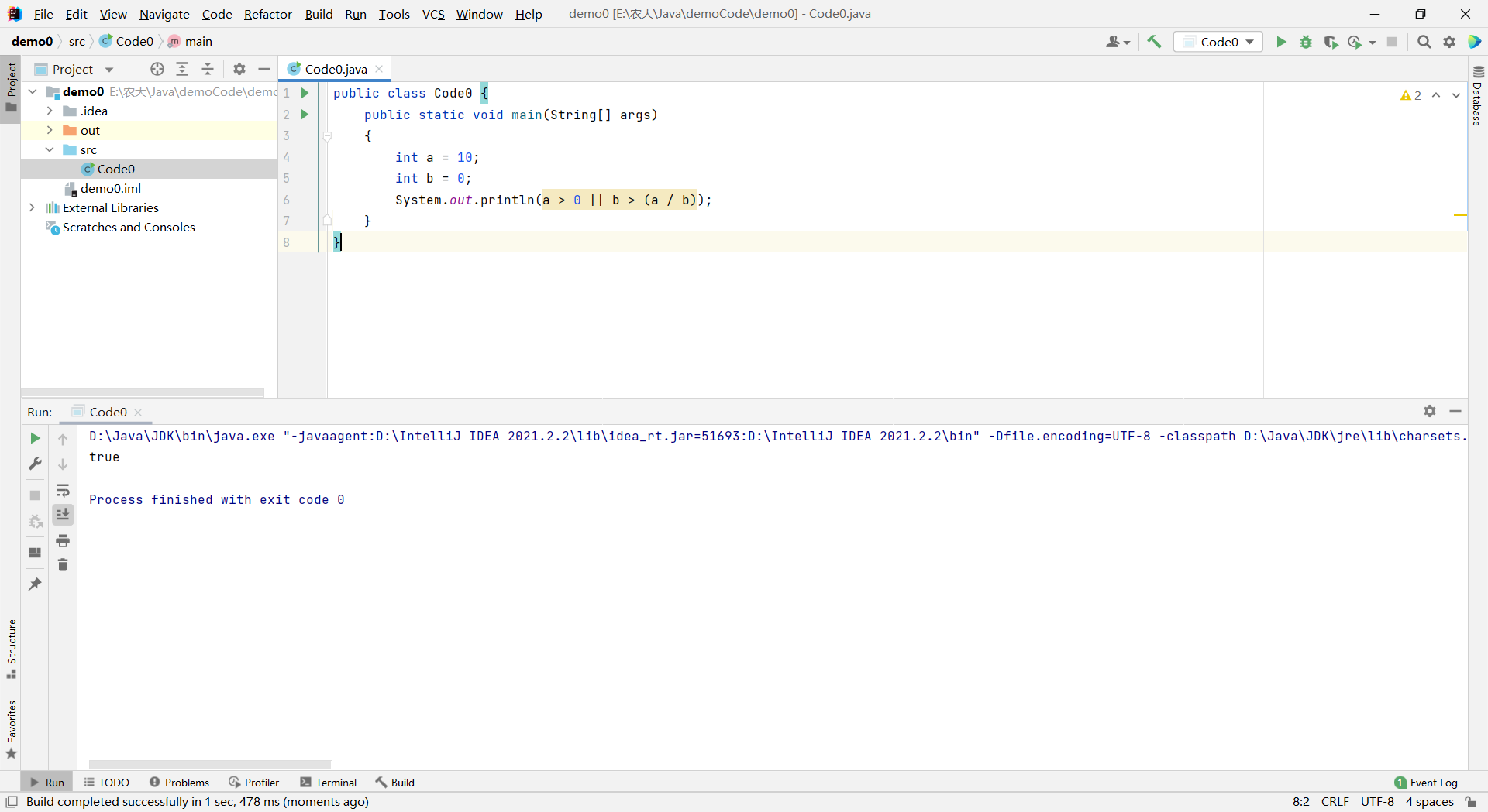 javapublic class Code0 { public static void main(String[] args) { int a = 10; int b = 0; System.out.println(a > 0 || b > (a / b)); } }运行结果: