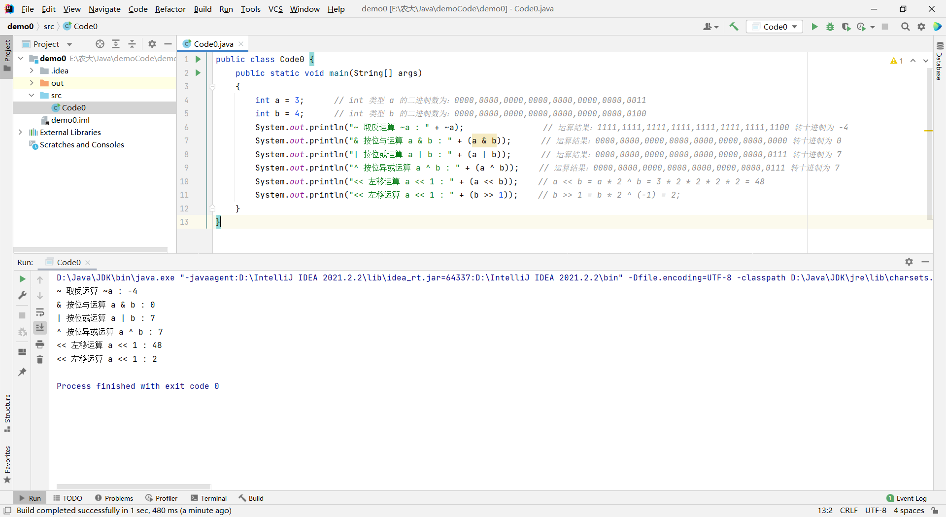 javapublic class Code0 { public static void main(String[] args) { int a = 3; // int 类型 a 的二进制数为:0000,0000,0000,0000,0000,0000,0000,0011 int b = 4; // int 类型 b 的二进制数为:0000,0000,0000,0000,0000,0000,0000,0100 System.out.println("~ 取反运算 ~a : " + ~a); // 运算结果:1111,1111,1111,1111,1111,1111,1111,1100 转十进制为 -4 System.out.println("& 按位与运算 a & b : " + (a & b)); // 运算结果:0000,0000,0000,0000,0000,0000,0000,0000 转十进制为 0 System.out.println("| 按位或运算 a | b : " + (a | b)); // 运算结果:0000,0000,0000,0000,0000,0000,0000,0111 转十进制为 7 System.out.println("^ 按位异或运算 a ^ b : " + (a ^ b)); // 运算结果:0000,0000,0000,0000,0000,0000,0000,0111 转十进制为 7 System.out.println("<< 左移运算 a << 1 : " + (a << b)); // a << b = a * 2 ^ b = 3 * 2 * 2 * 2 * 2 = 48 System.out.println("<< 左移运算 a << 1 : " + (b >> 1)); // b >> 1 = b * 2 ^ (-1) = 2; } }运行结果: