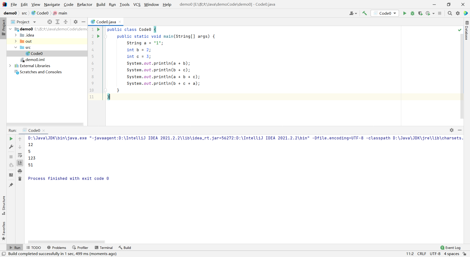 javapublic class Code0 { public static void main(String[] args) { String a = "1"; int b = 2; int c = 3; System.out.println(a + b); System.out.println(b + c); System.out.println(a + b + c); System.out.println(b + c + a); } }运行结果: