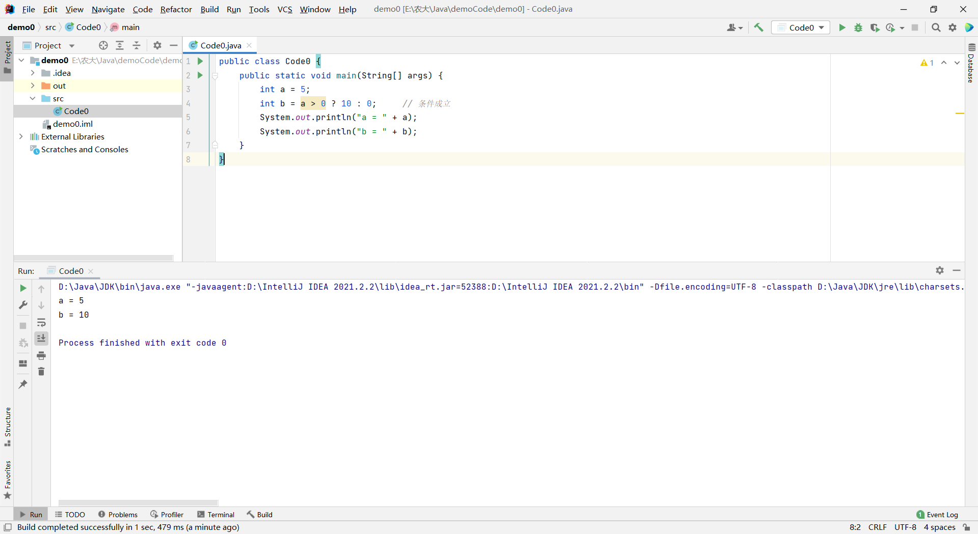 javapublic class Code0 { public static void main(String[] args) { int a = 5; int b = a > 0 ? 10 : 0; // 条件成立 System.out.println("a = " + a); System.out.println("b = " + b); } }运算结果: