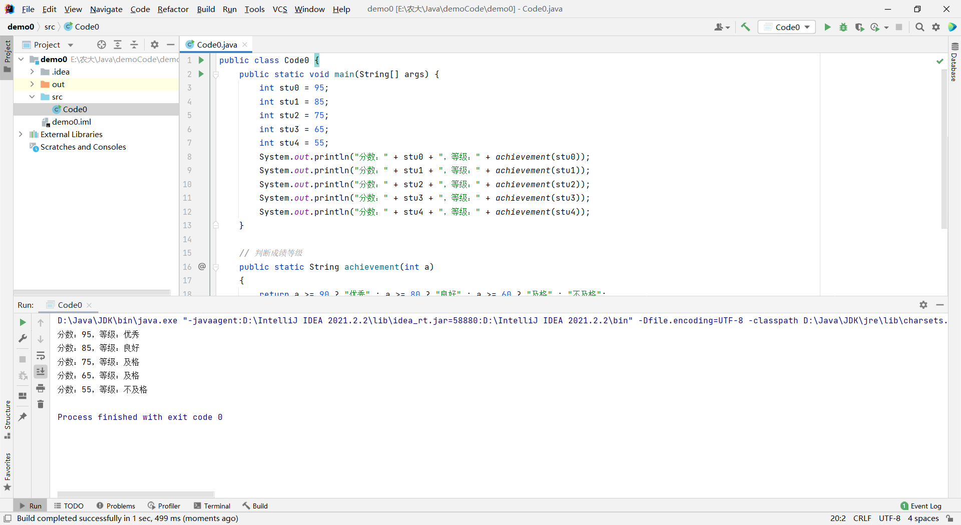 javapublic class Code0 { public static void main(String[] args) { int stu0 = 95; int stu1 = 85; int stu2 = 75; int stu3 = 65; int stu4 = 55; System.out.println("分数:" + stu0 + ",等级:" + achievement(stu0)); System.out.println("分数:" + stu1 + ",等级:" + achievement(stu1)); System.out.println("分数:" + stu2 + ",等级:" + achievement(stu2)); System.out.println("分数:" + stu3 + ",等级:" + achievement(stu3)); System.out.println("分数:" + stu4 + ",等级:" + achievement(stu4)); } // 判断成绩等级 public static String achievement(int a) { return a >= 90 ? "优秀" : a >= 80 ? "良好" : a >= 60 ? "及格" : "不及格"; } }运行结果: