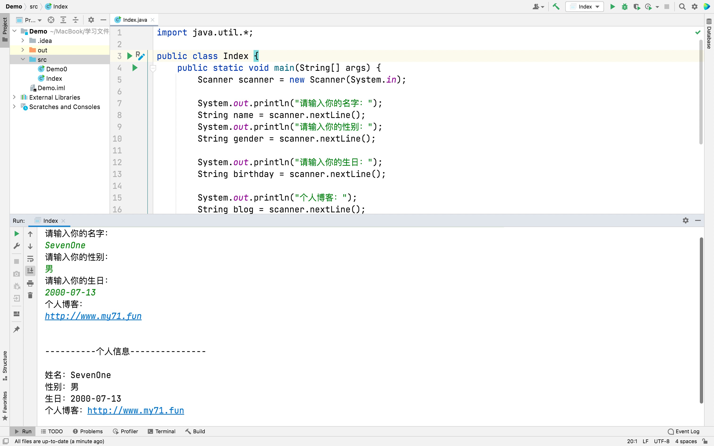 javaimport java.util.*; public class Index { public static void main(String[] args) { Scanner scanner = new Scanner(System.in); System.out.println("请输入你的名字:"); String name = scanner.nextLine(); System.out.println("请输入你的性别:"); String gender = scanner.nextLine(); System.out.println("请输入你的生日:"); String birthday = scanner.nextLine(); System.out.println("个人博客:"); String blog = scanner.nextLine(); System.out.println("\n\n----------个人信息---------------\n"); System.out.println("姓名:" + name + "\n性别:" + gender + "\n生日:" + birthday + "\n个人博客:" + blog); } }运行结果: