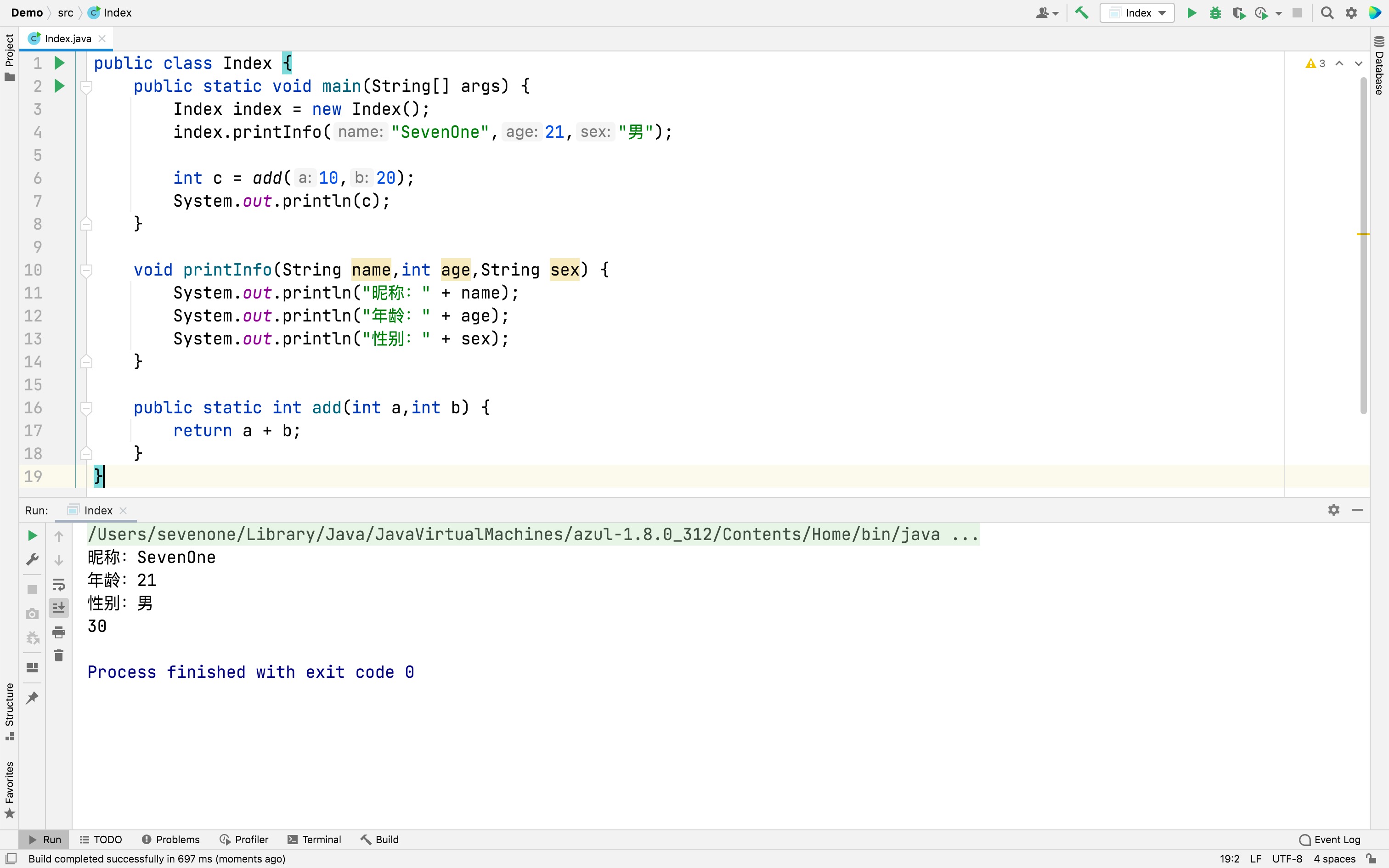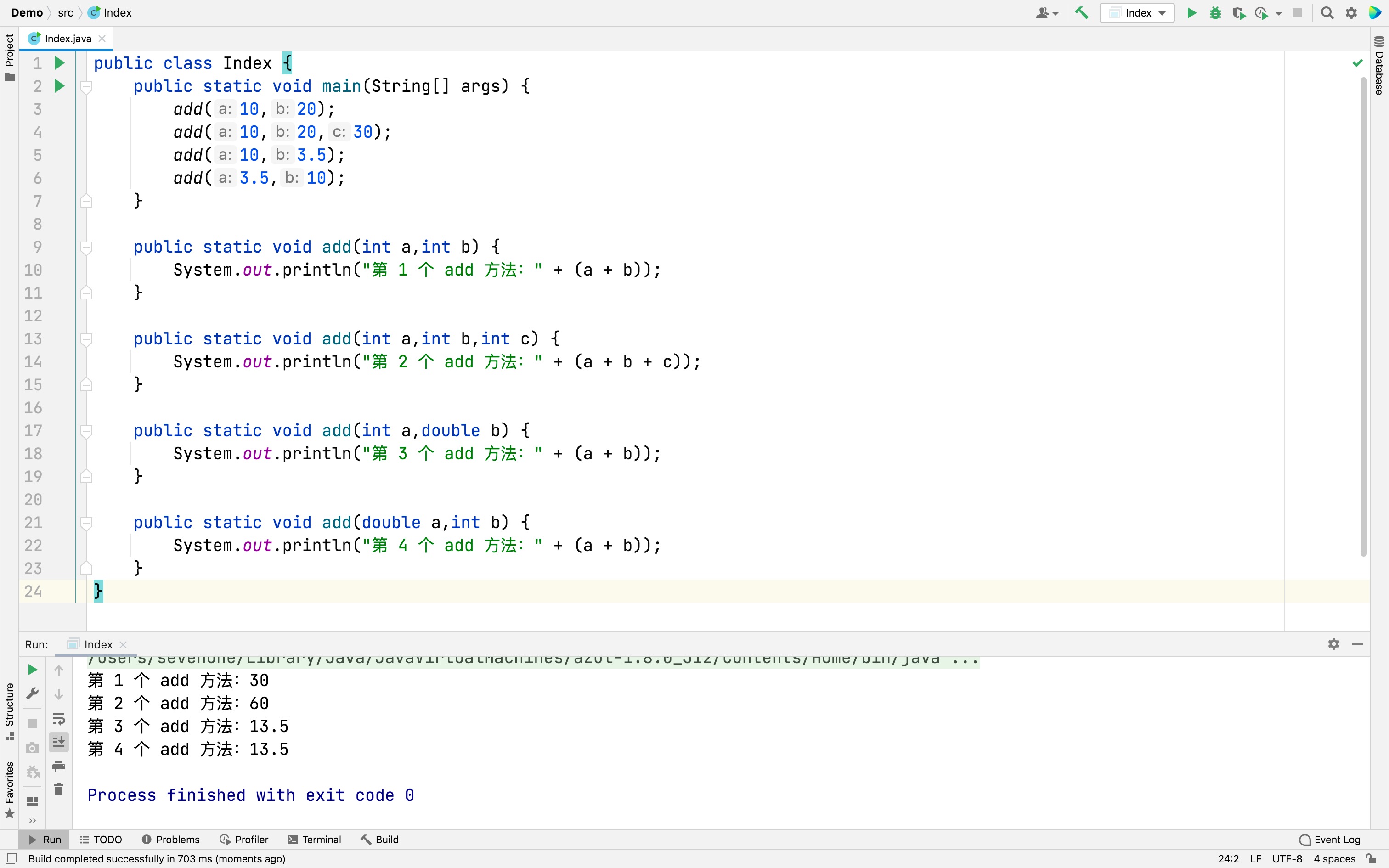 javapublic class Index { public static void main(String[] args) { add(10,20); add(10,20,30); add(10,3.5); add(3.5,10); } public static void add(int a,int b) { System.out.println("第 1 个 add 方法:" + (a + b)); } public static void add(int a,int b,int c) { System.out.println("第 2 个 add 方法:" + (a + b + c)); } public static void add(int a,double b) { System.out.println("第 3 个 add 方法:" + (a + b)); } public static void add(double a,int b) { System.out.println("第 4 个 add 方法:" + (a + b)); } }