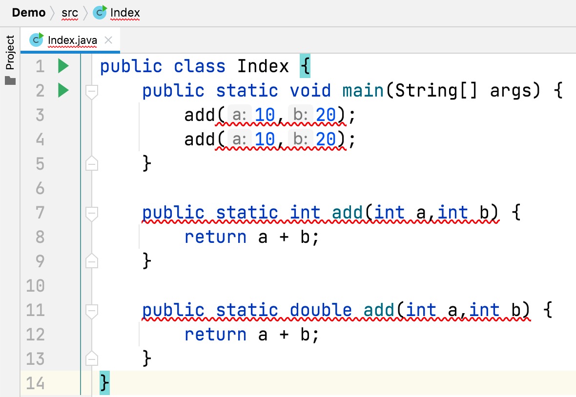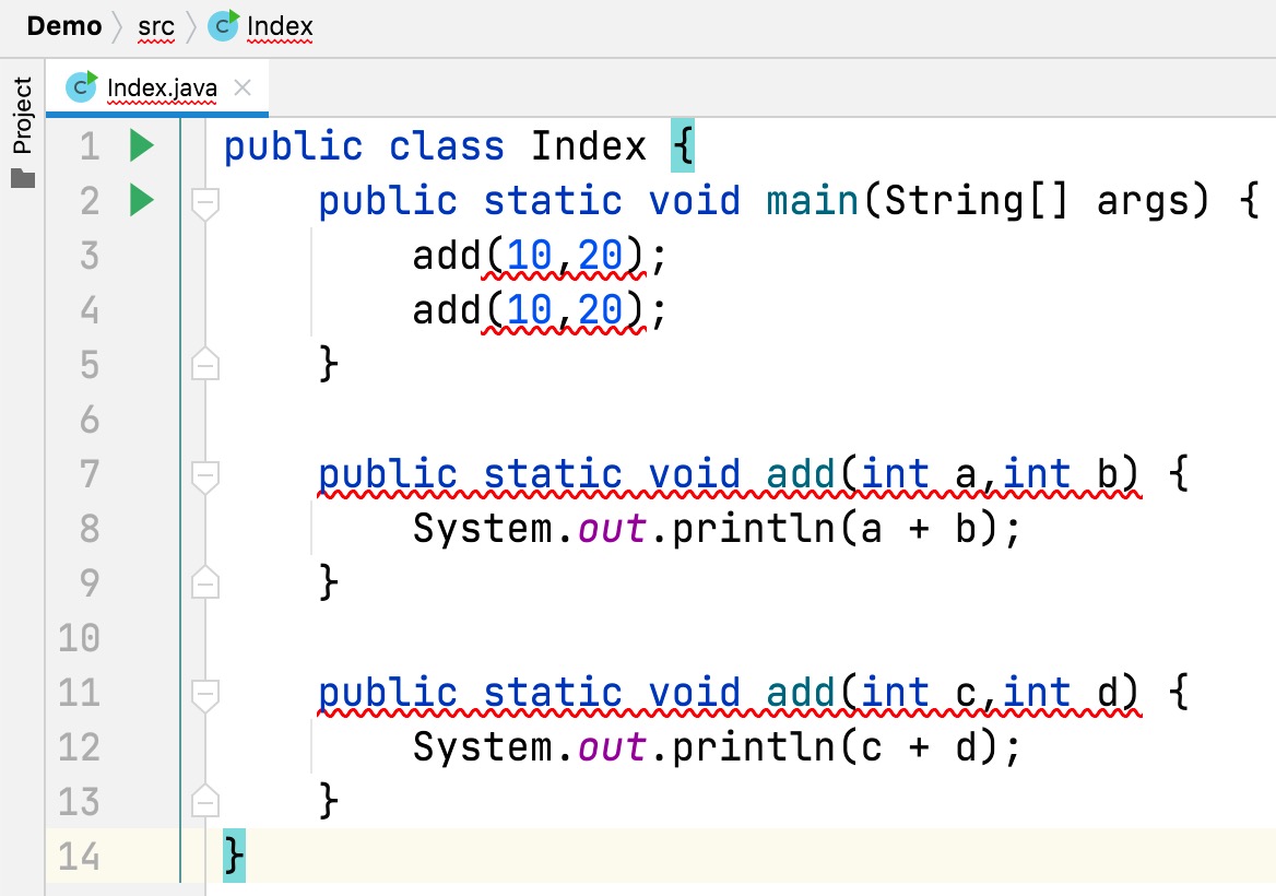 javapublic class Index { public static void main(String[] args) { add(10,20); add(10,20); } public static void add(int a,int b) { System.out.println(a + b); } public static void add(int c,int d) { System.out.println(c + d); } }