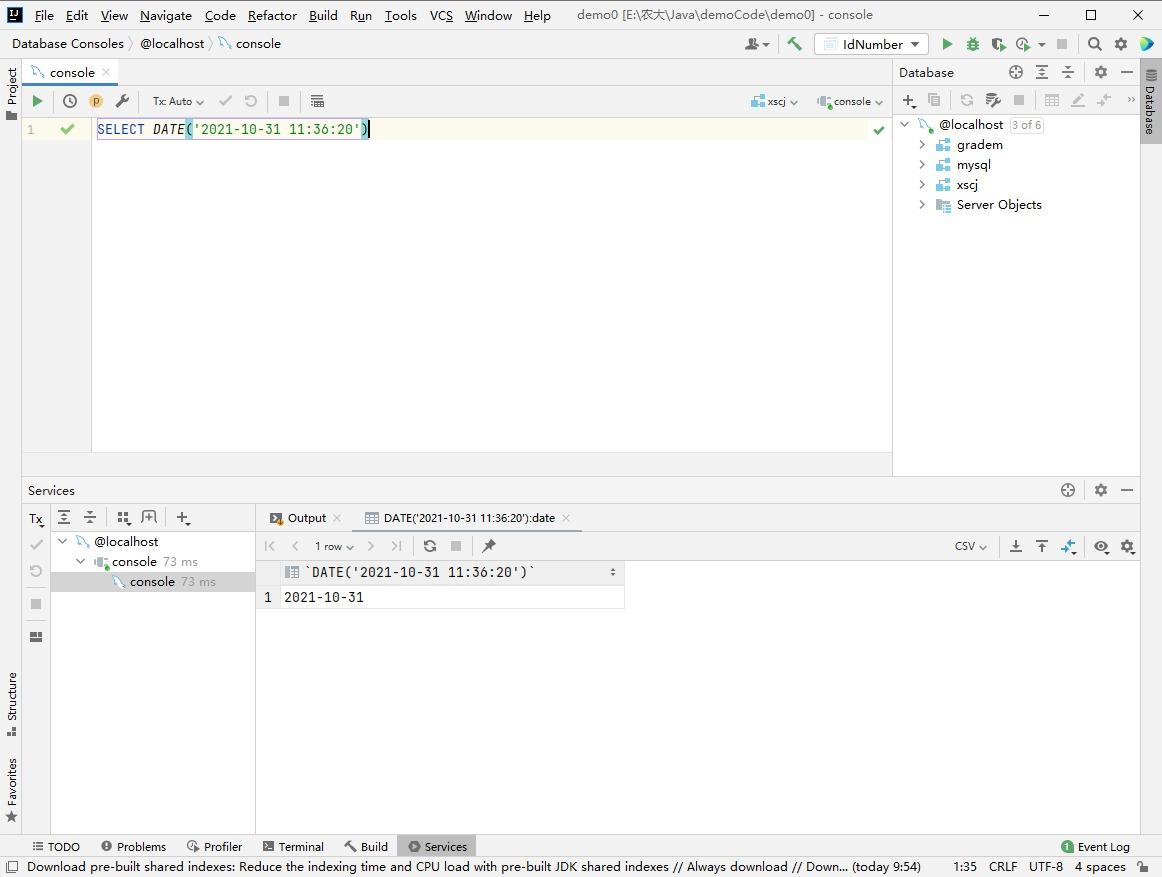 SQLSELECT DATE('2021-10-31 11:36:20')运行结果