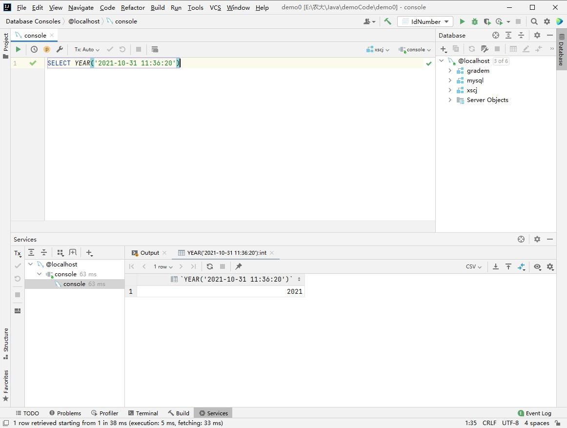 SQLSELECT YEAR('2021-10-31 11:36:20')运行结果