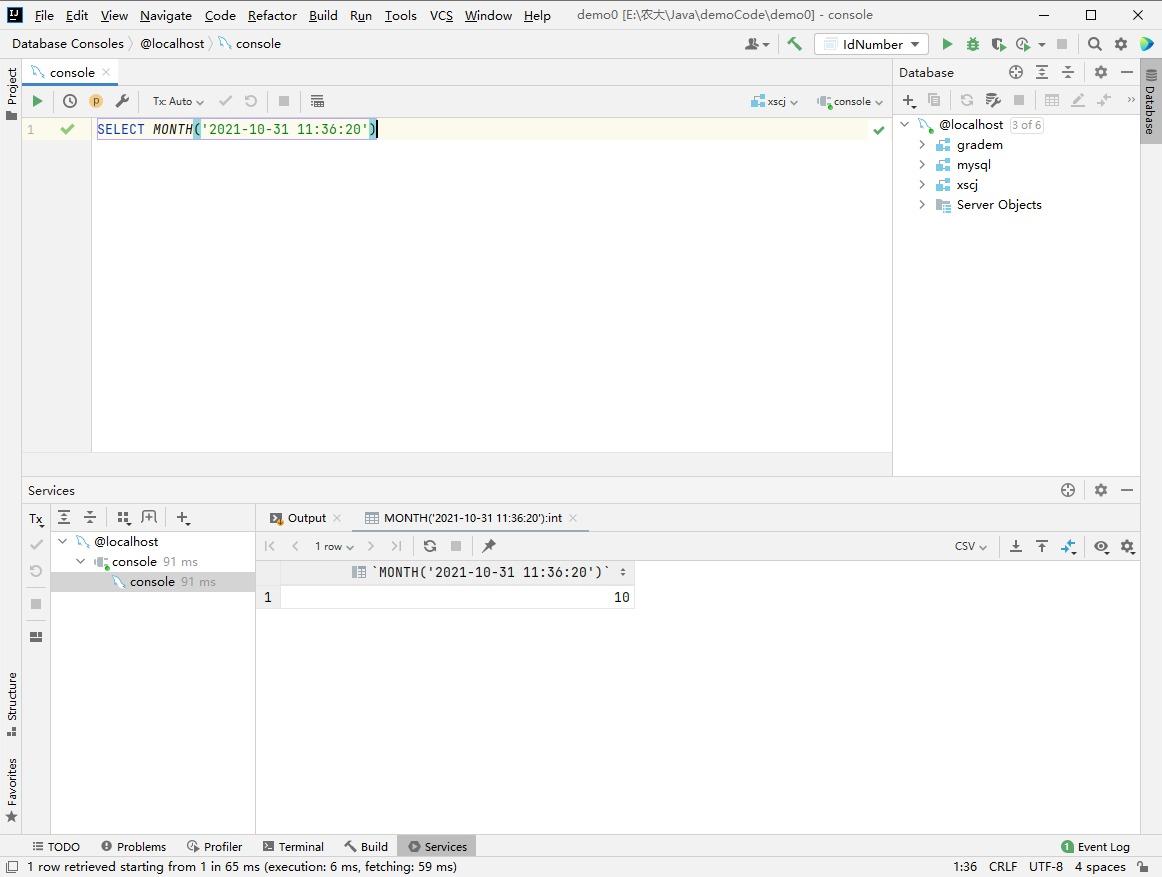 SQLSELECT MONTH('2021-10-31 11:36:20')运行结果