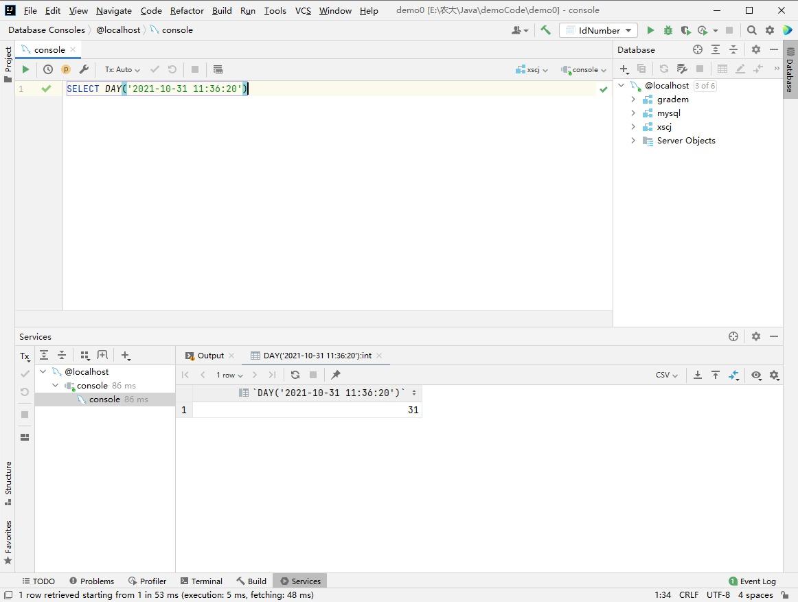 SQLSELECT DAY('2021-10-31 11:36:20')运行结果