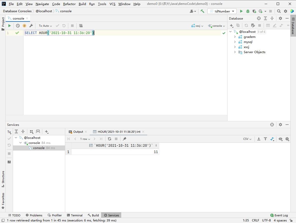 SQLSELECT HOUR('2021-10-31 11:36:20')运行结果