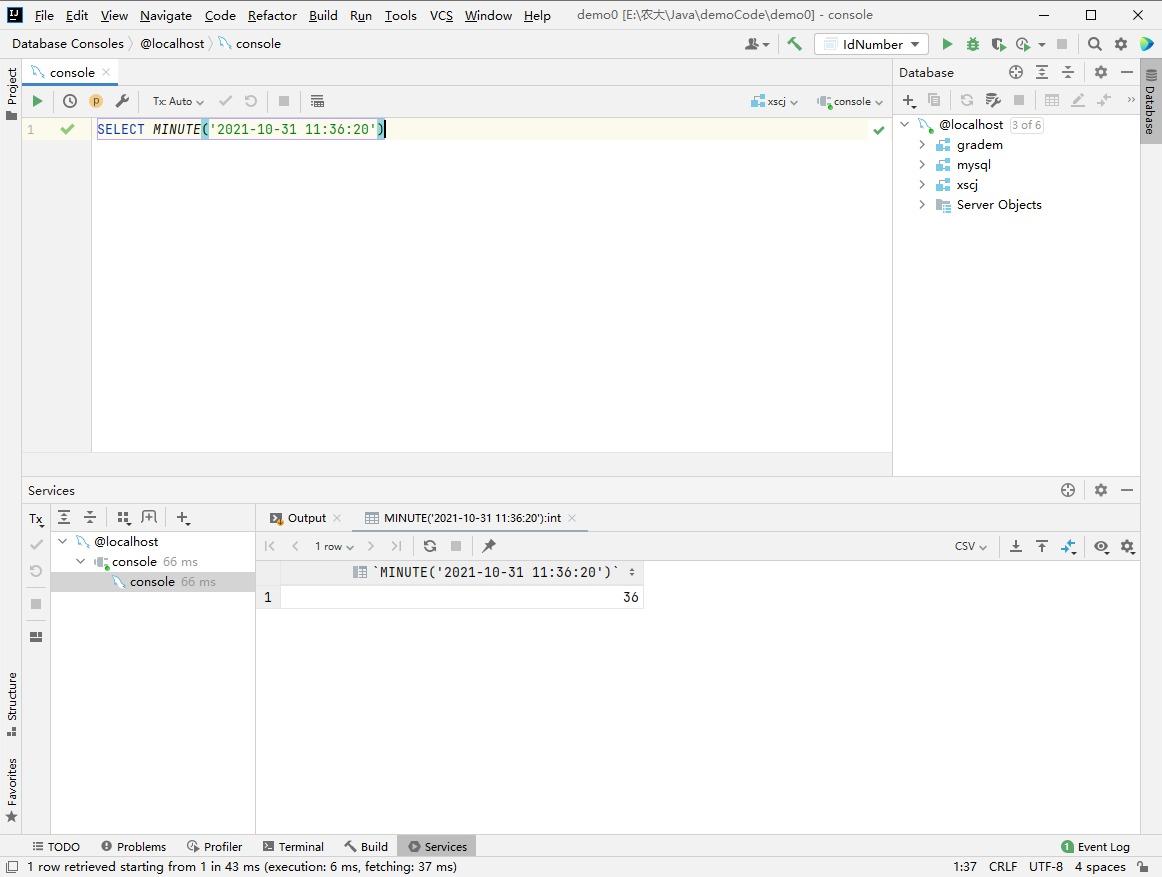 SQLSELECT MINUTE('2021-10-31 11:36:20')运行结果