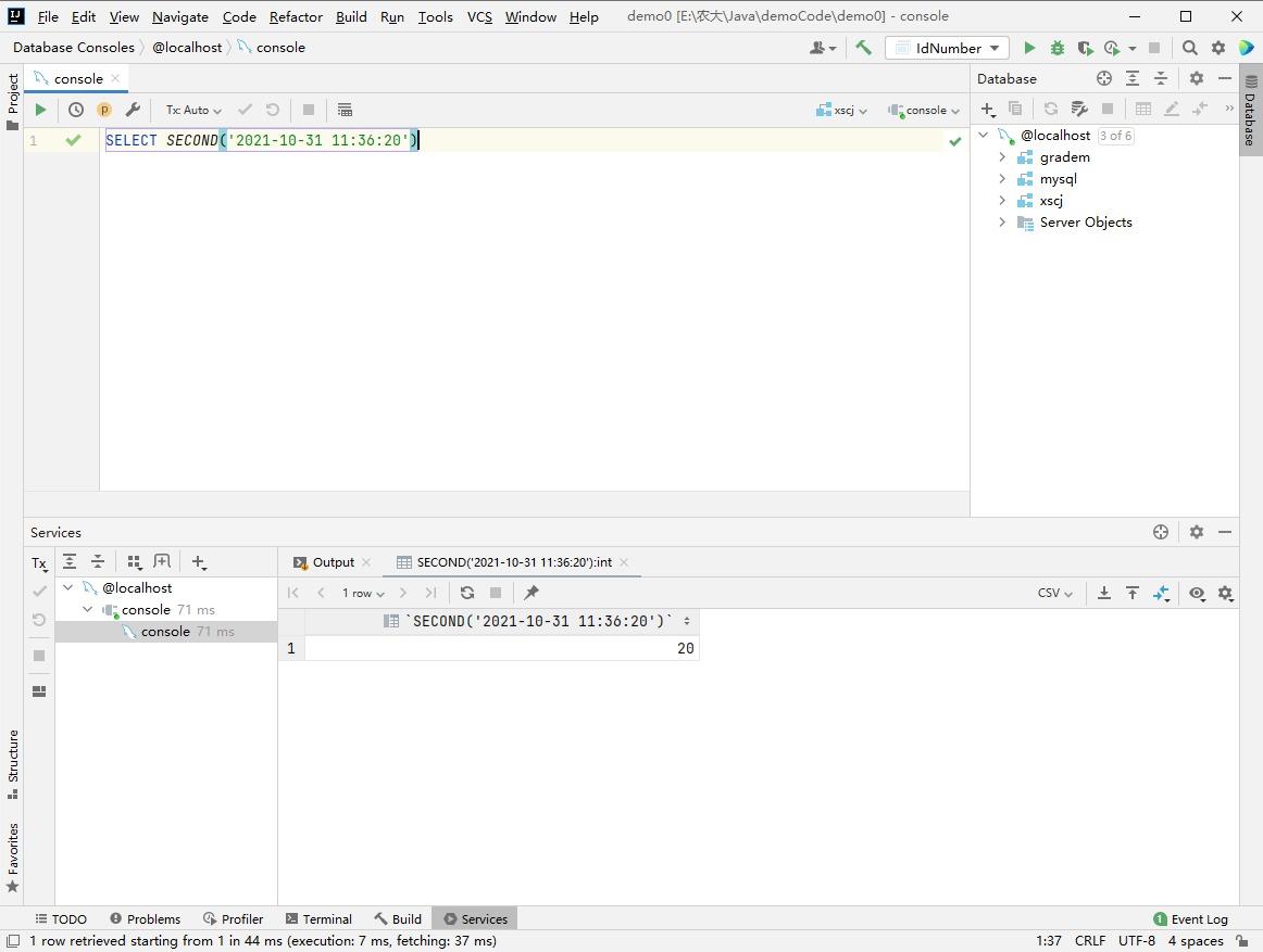 SQLSELECT SECOND('2021-10-31 11:36:20')运行结果