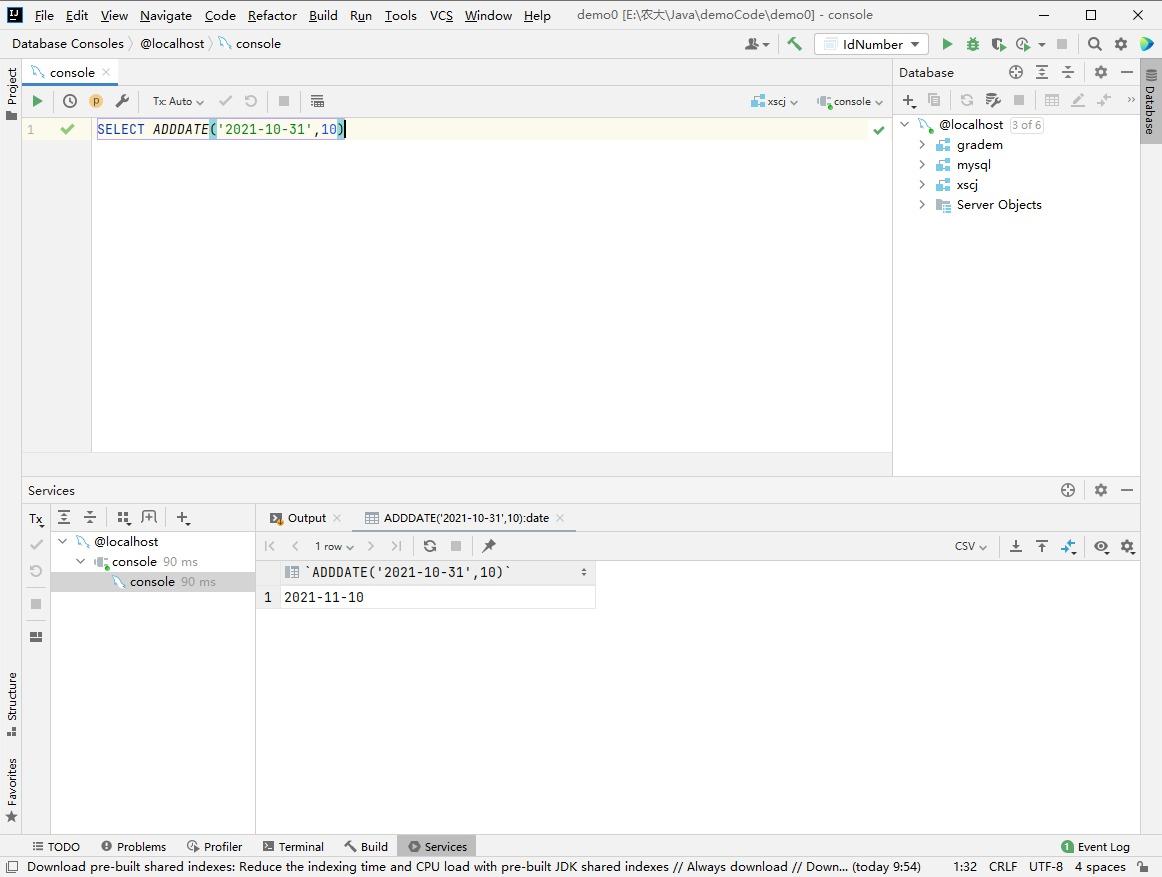 SQLSELECT ADDDATE('2021-10-31',10)运行结果