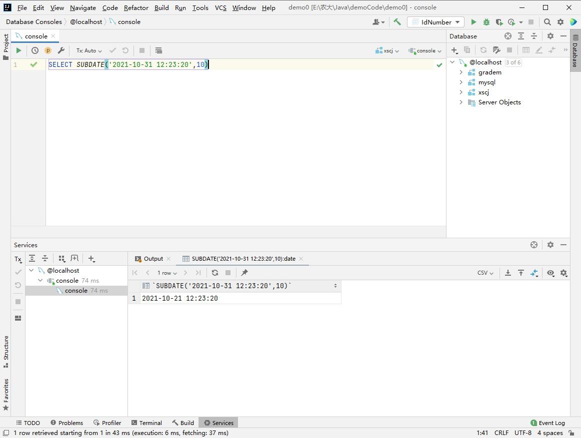SQLSELECT SUBDATE('2021-10-31 12:23:20',10)运行结果