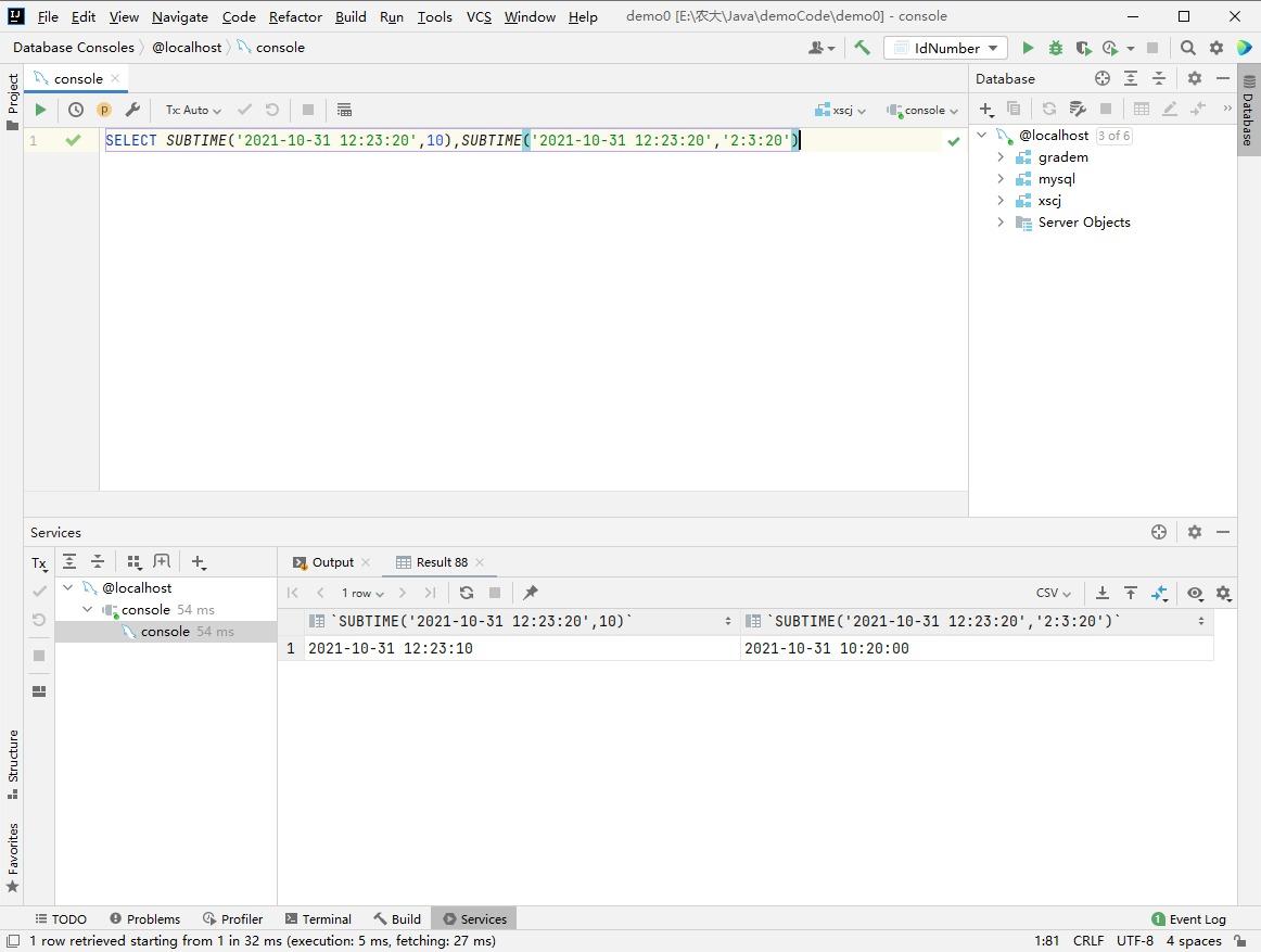 SQLSELECT SUBTIME('2021-10-31 12:23:20',10),SUBTIME('2021-10-31 12:23:20','2:3:20')运行结果
