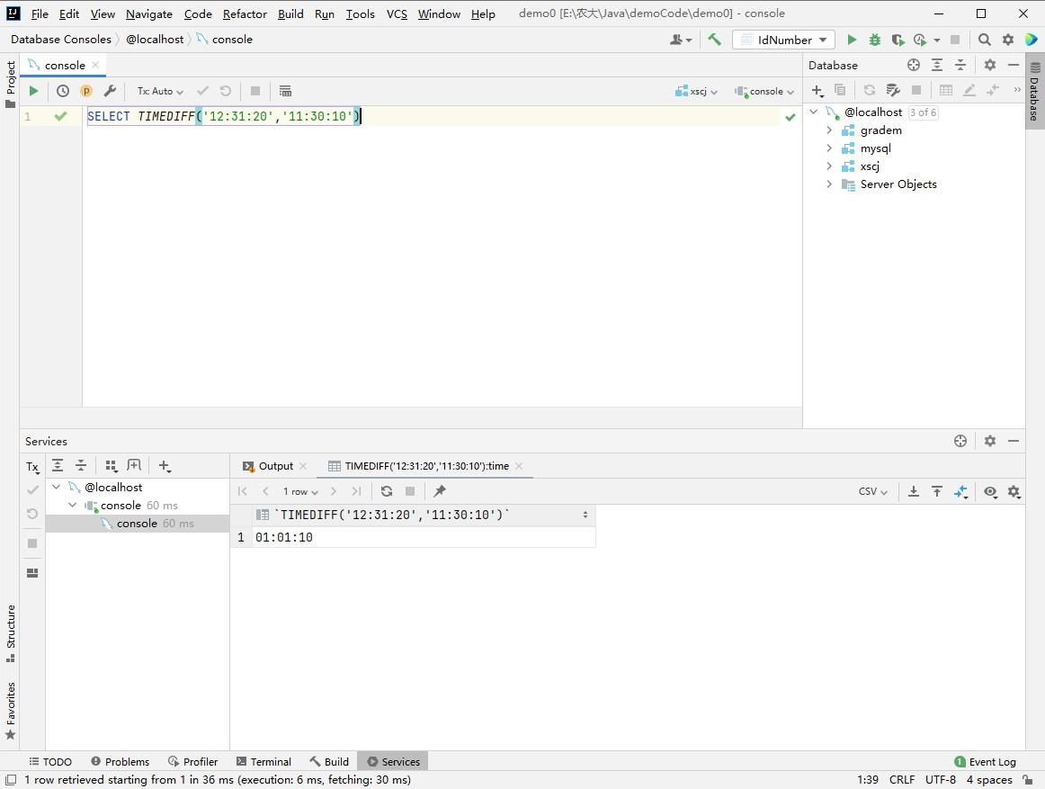 SQLSELECT TIMEDIFF('12:31:20','11:30:10')运行结果