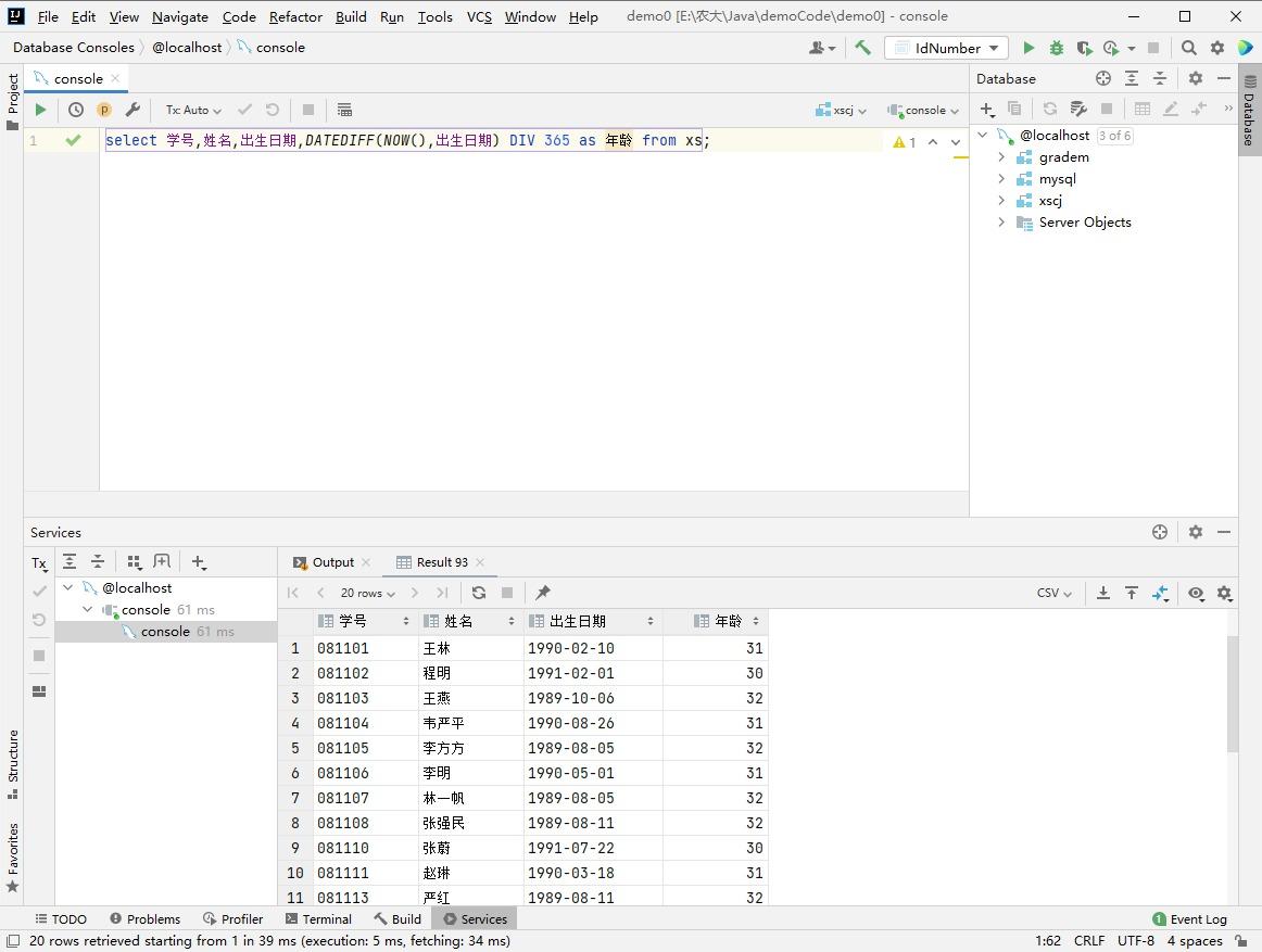 SQLselect 学号,姓名,出生日期,DATEDIFF(NOW(),出生日期) DIV 365 as 年龄 from xs;运行结果