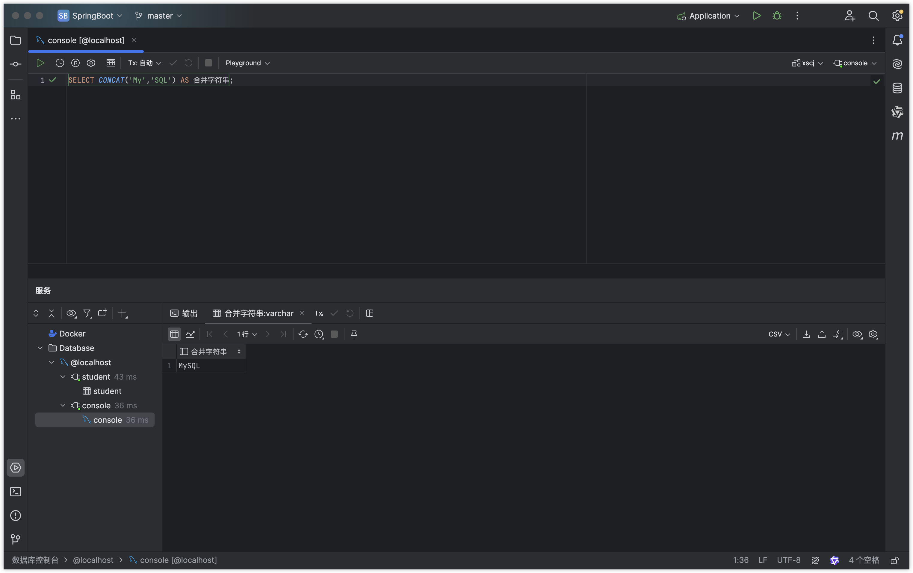 SQLSELECT CONCAT('My','SQL') AS 合并字符串;运行结果