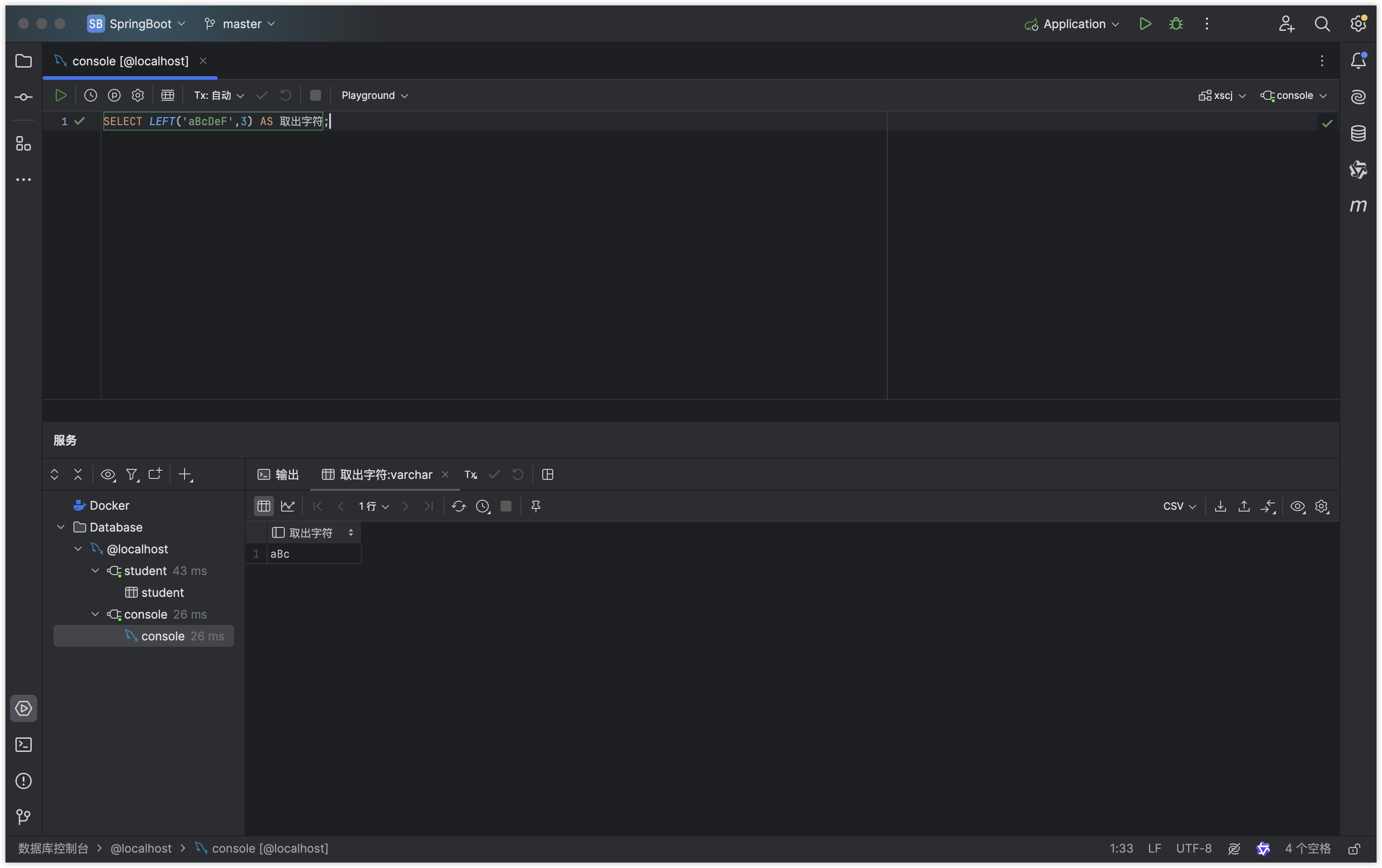 SQLSELECT LEFT('aBcDeF',3) AS 取出字符;运行结果