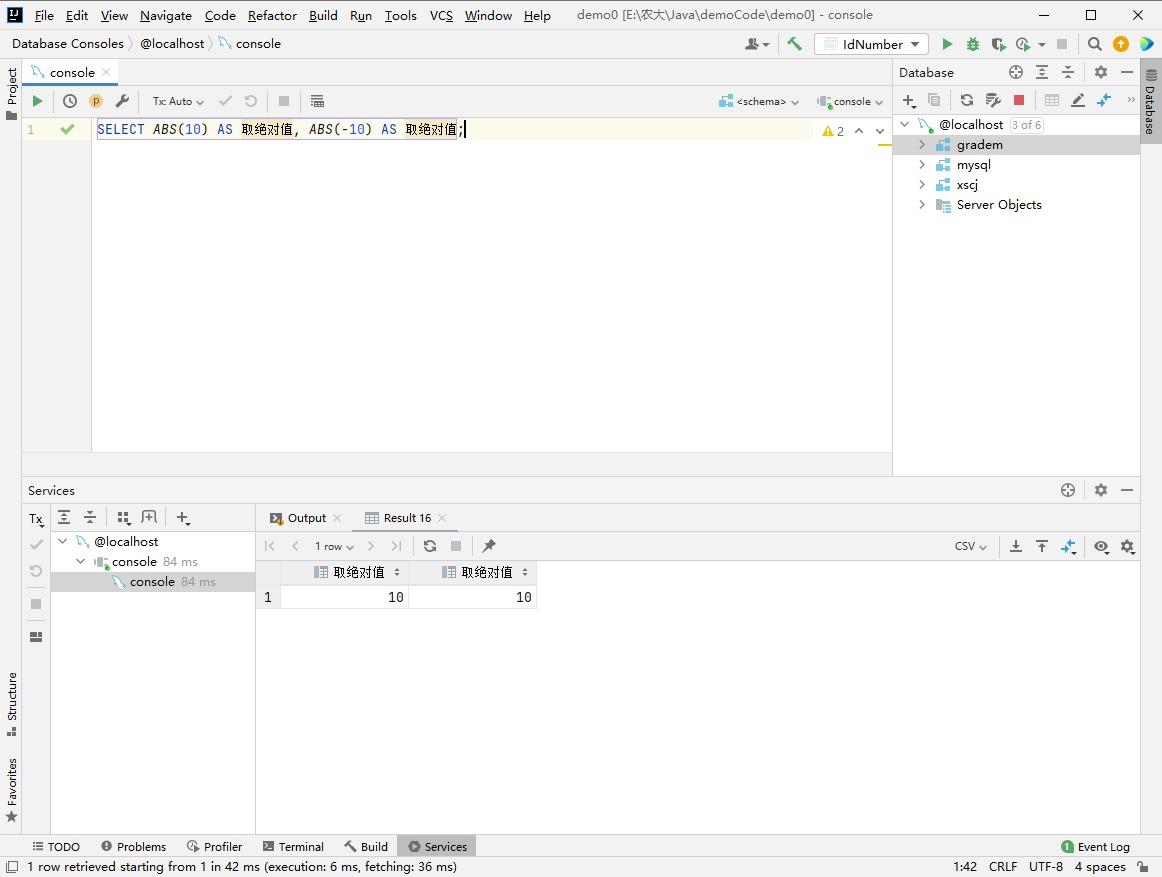 SQLSELECT ABS(10) AS 取绝对值, ABS(-10) AS 取绝对值;运行结果