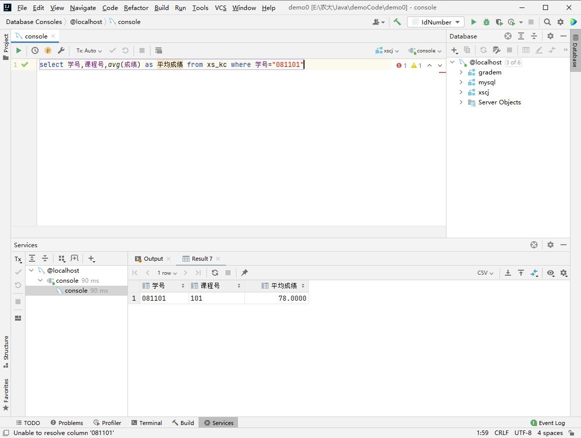 SQLselect 学号,课程号,avg(成绩) as 平均成绩 from xs_kc where 学号="081101"运行结果