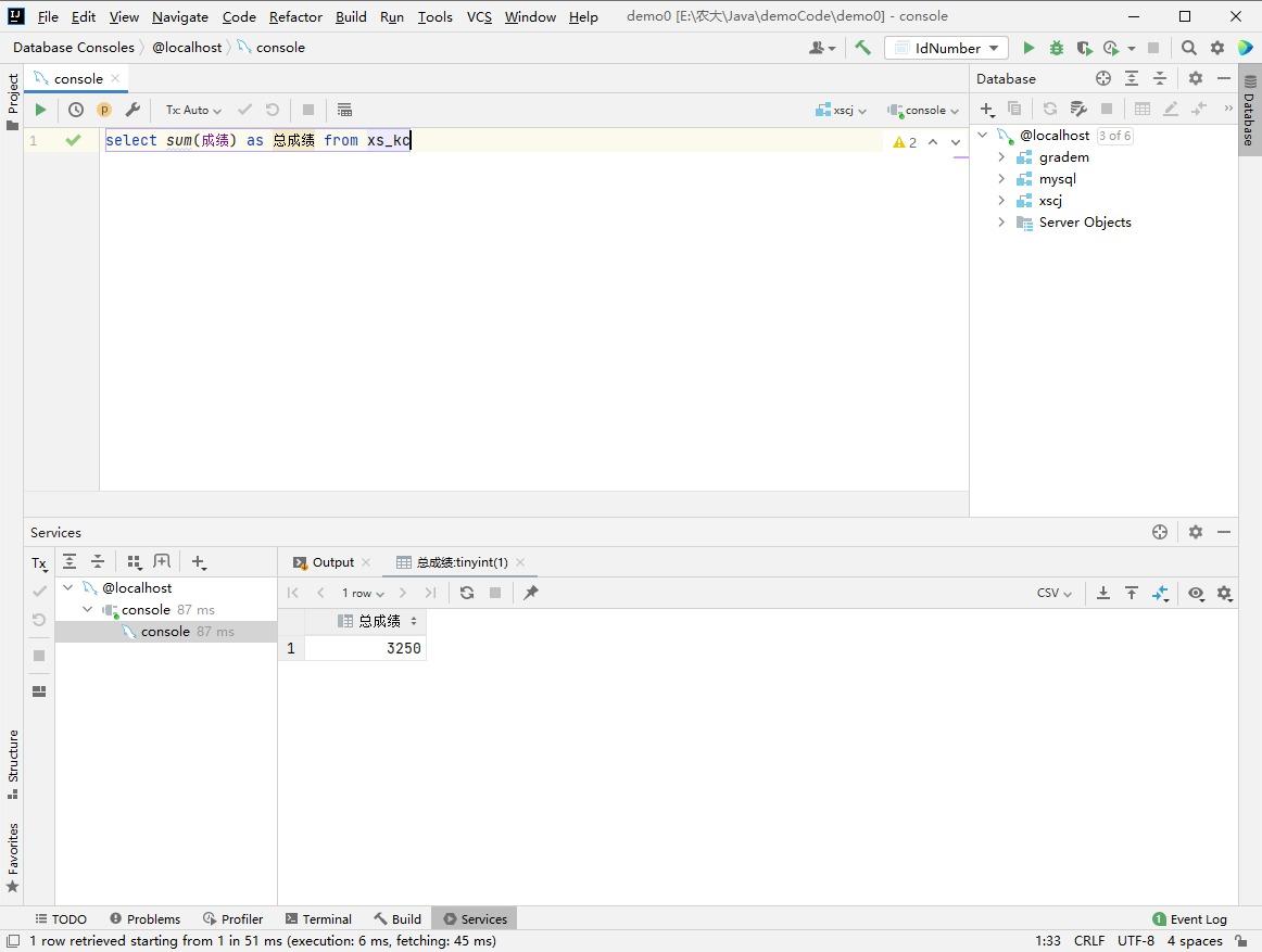 需求:计算 xs_kc 表中所有学生的成绩和。