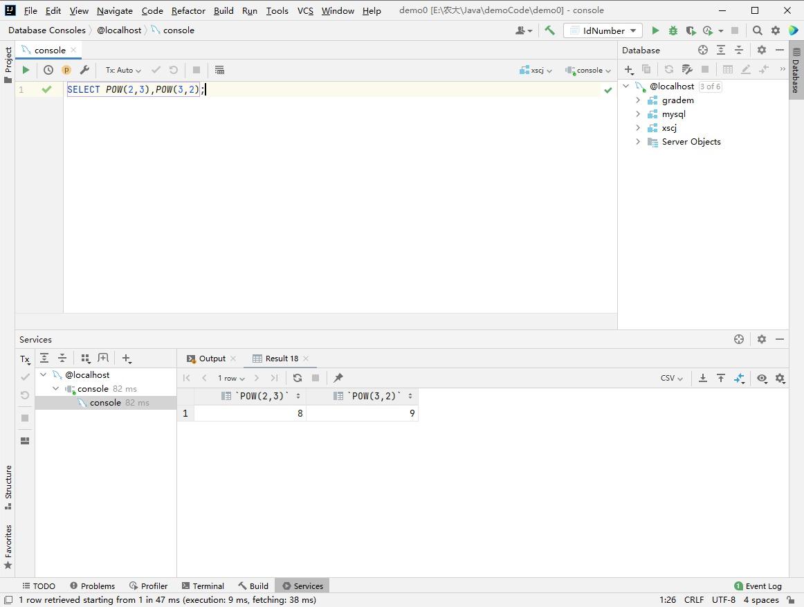 SQLSELECT POW(2,3),POW(3,2);运行结果