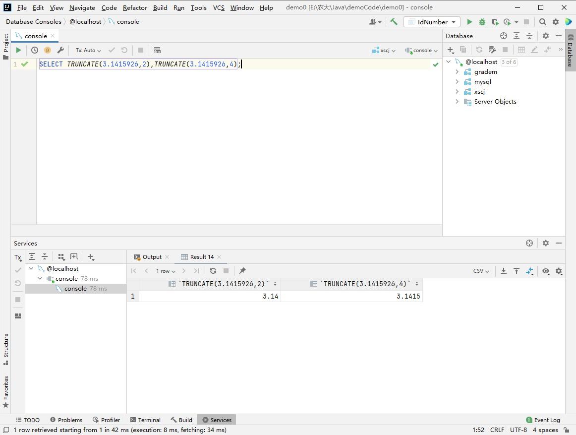 SQLSELECT TRUNCATE(3.1415926,2),TRUNCATE(3.1415926,4);运行结果